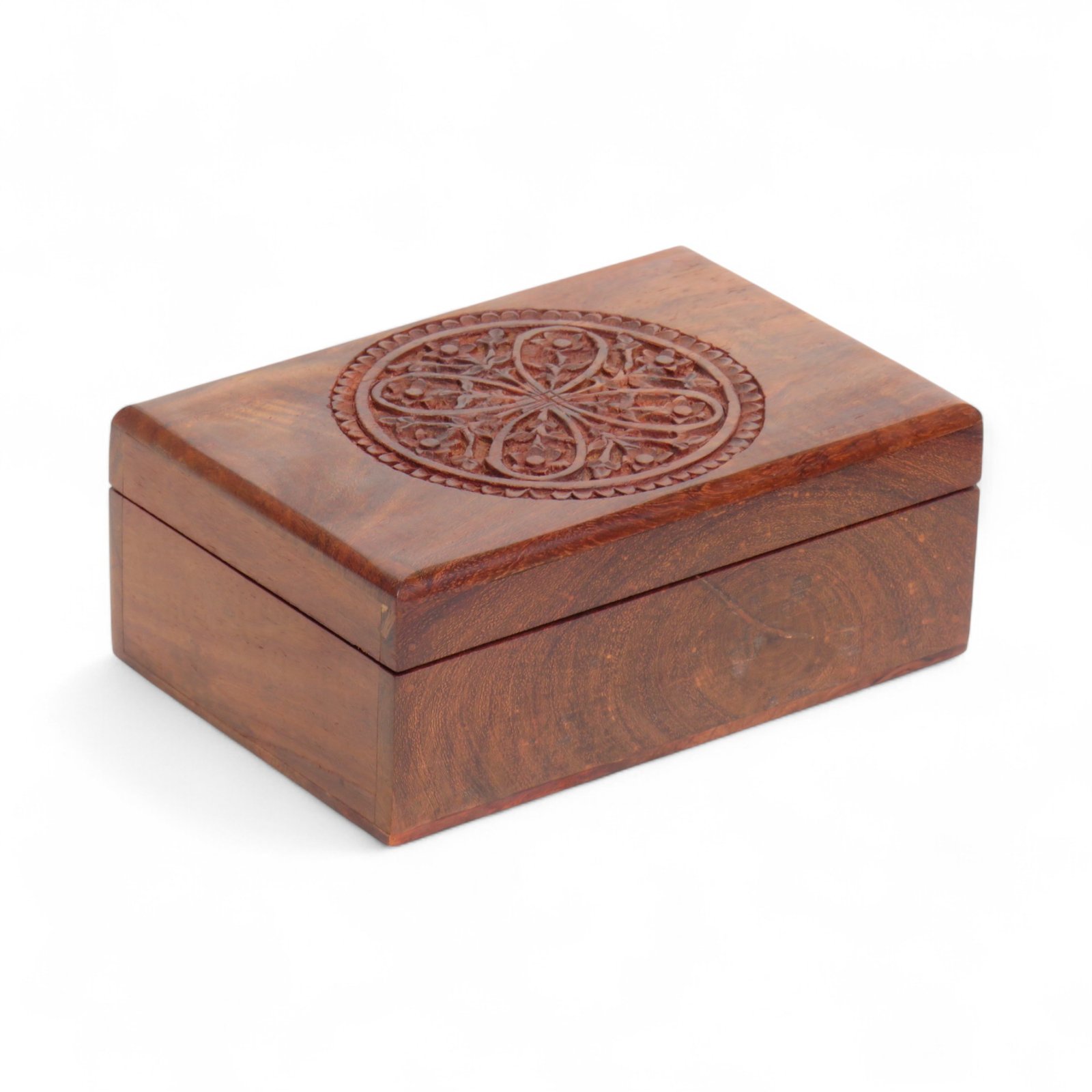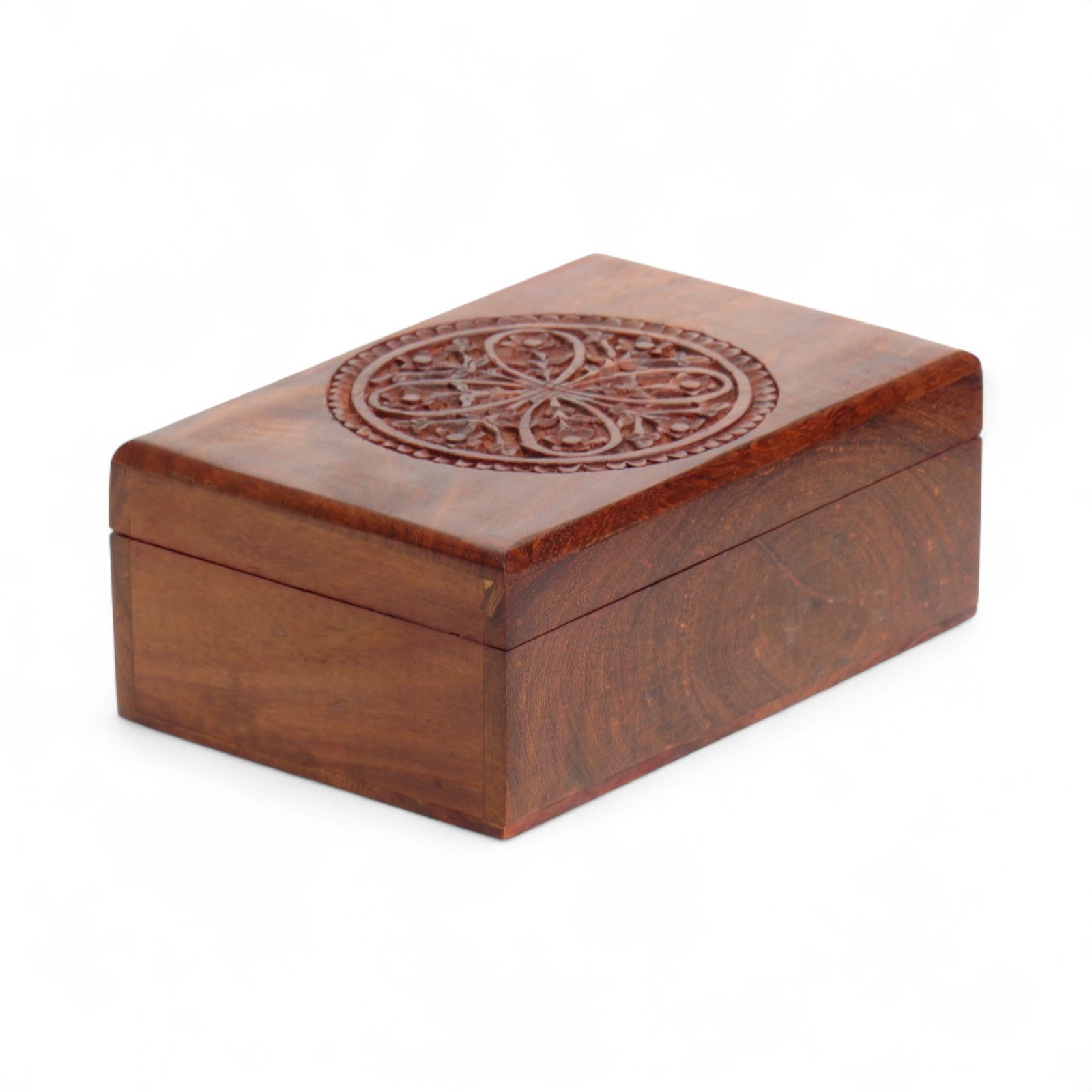 This Handmade Sheesham Wood Storage Box is a stunning piece of craftsmanship, featuring an elegant circle design carving that gives it a timeless antique look.