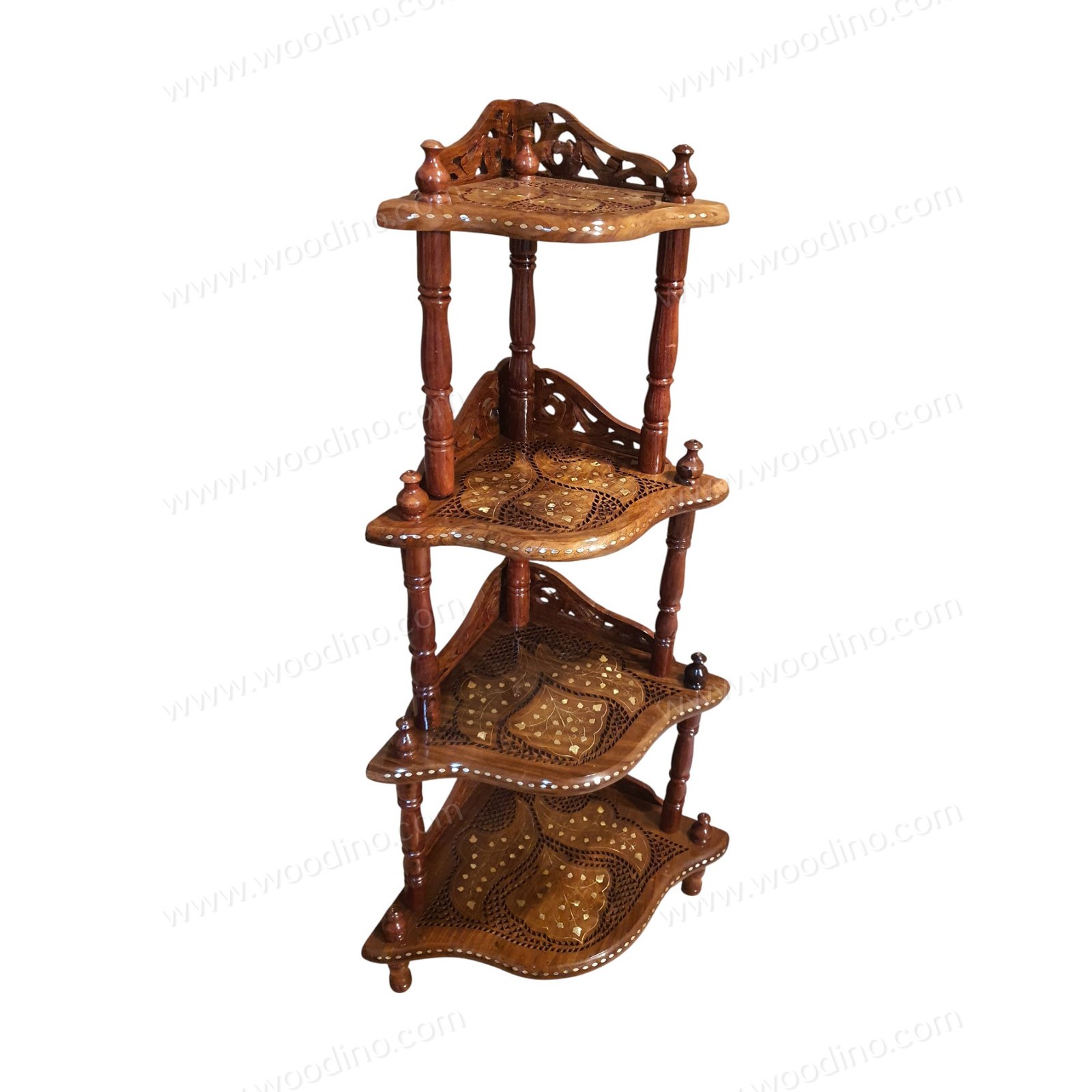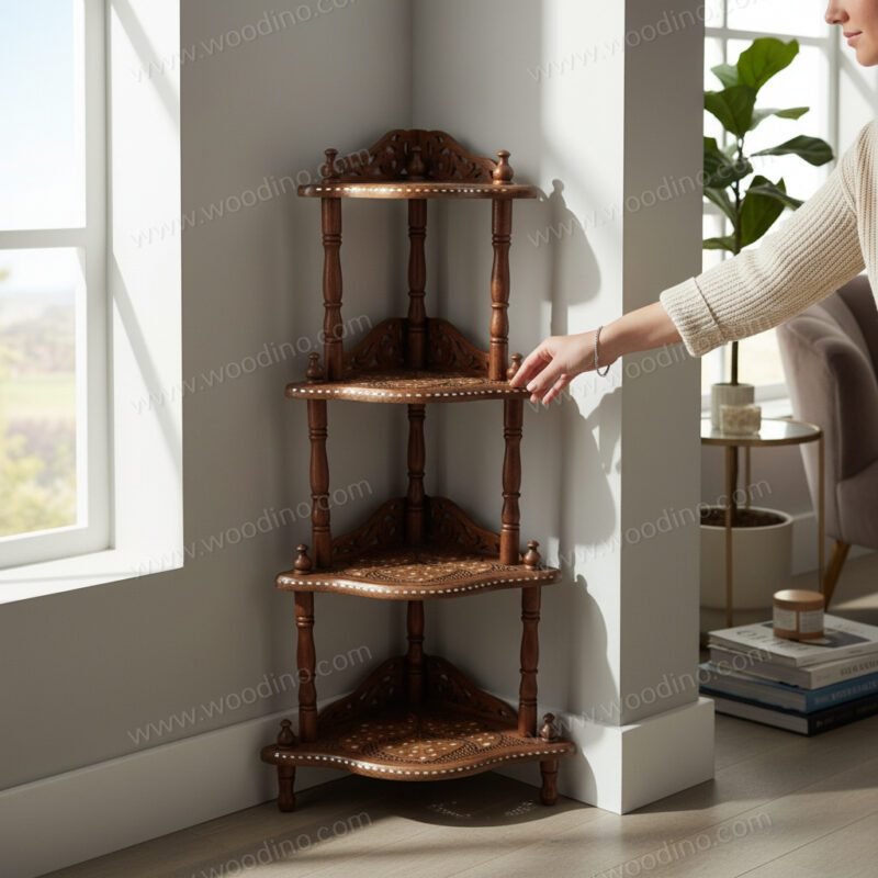 Upgrade your home décor with the Woodino Sheesham Wood Corner Shelf Stand, a premium handcrafted corner rack designed to enhance unused corners with elegance and utility. Made from 100% pure sheesham wood (shisham wood), this floor-standing shelf unit features 4 spacious shelves with fine jaali/net work and brass inlay detailing, giving it a rich traditional Indian look.
