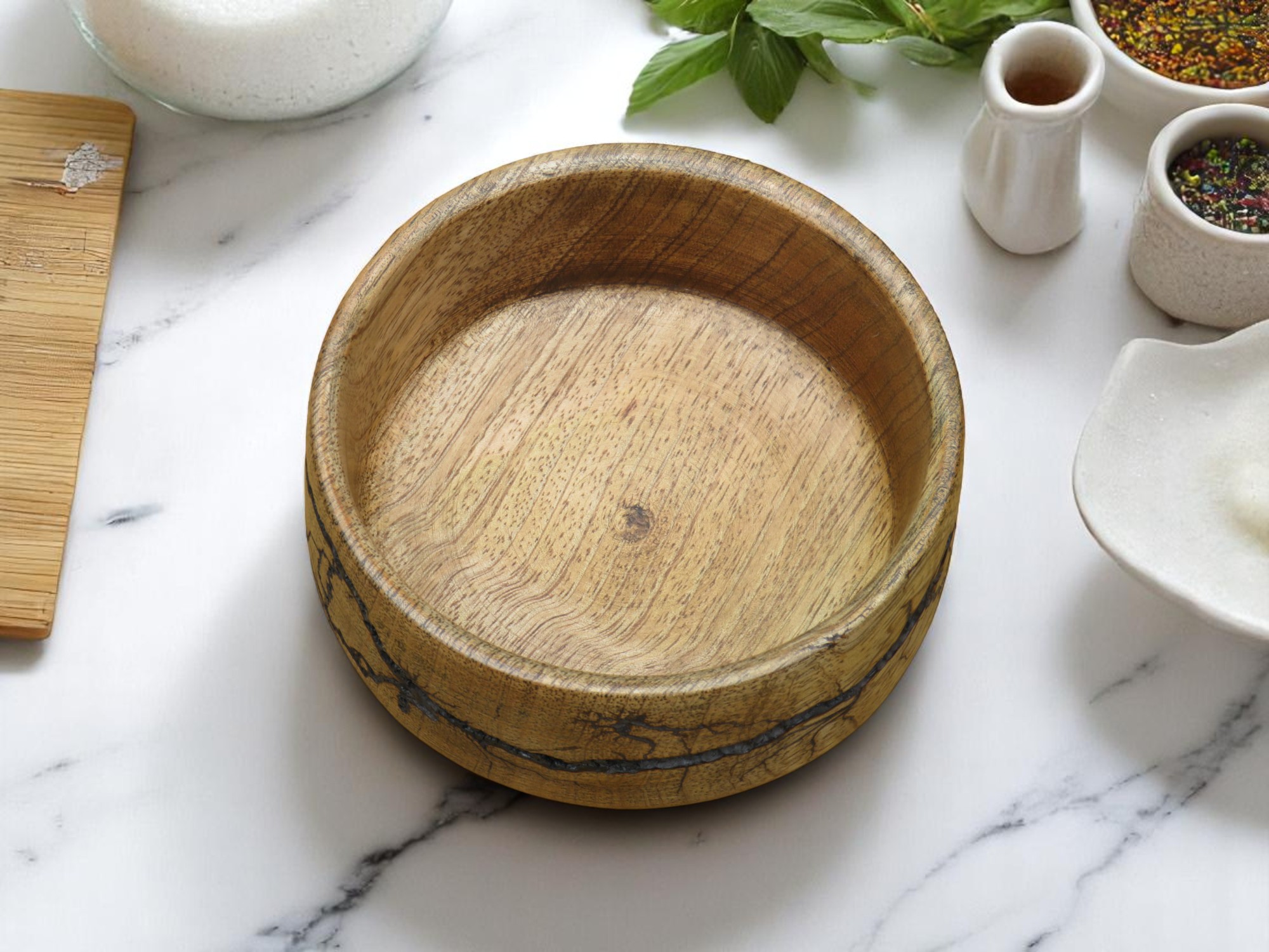 Bring elegance to your dining with this Round Mango Wood Bowl (5×2 Inch), handcrafted from natural solid mango wood. Its compact size makes it perfect for serving candy, dry fruits, snacks, desserts, or dips, while also working as a decorative accent piece.