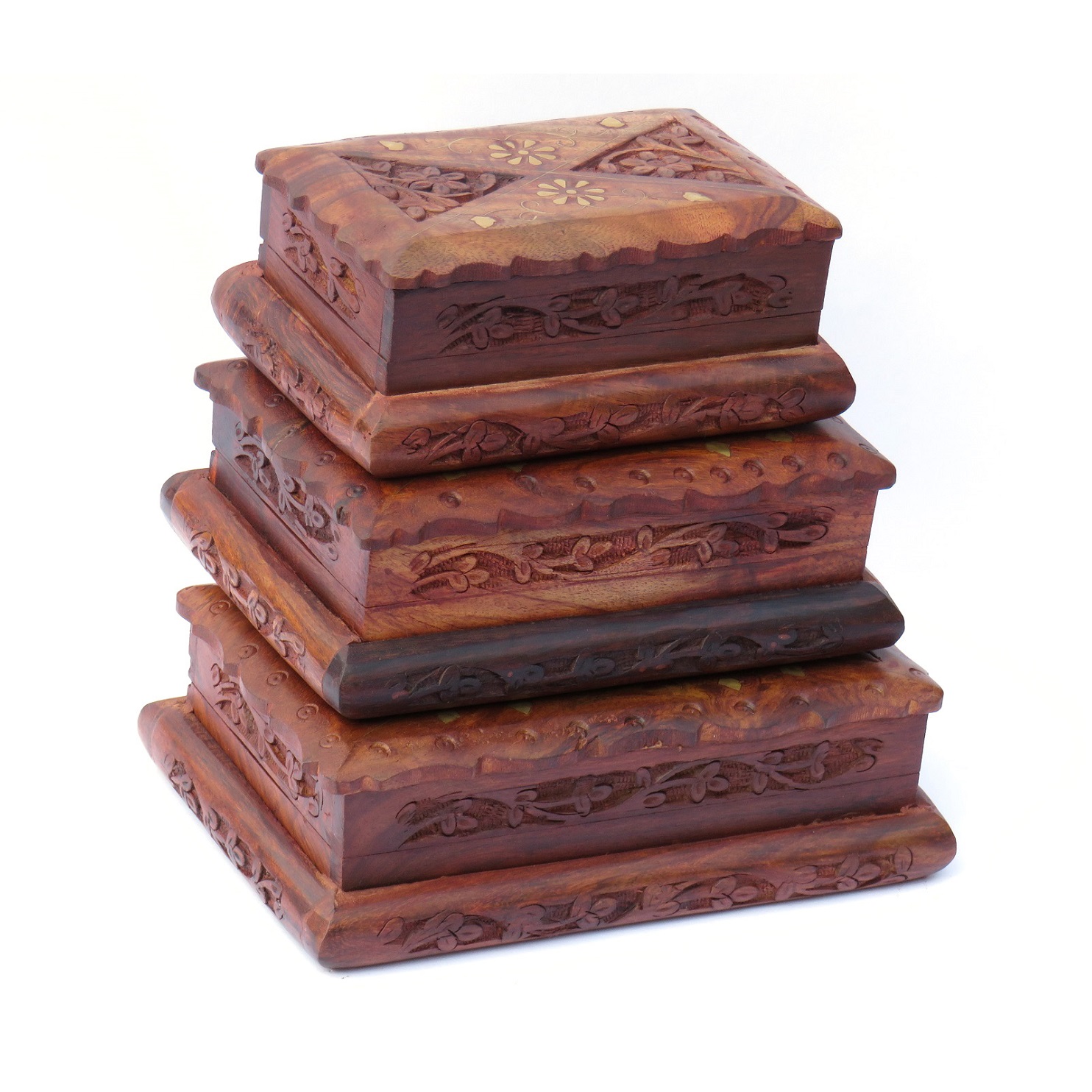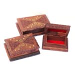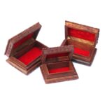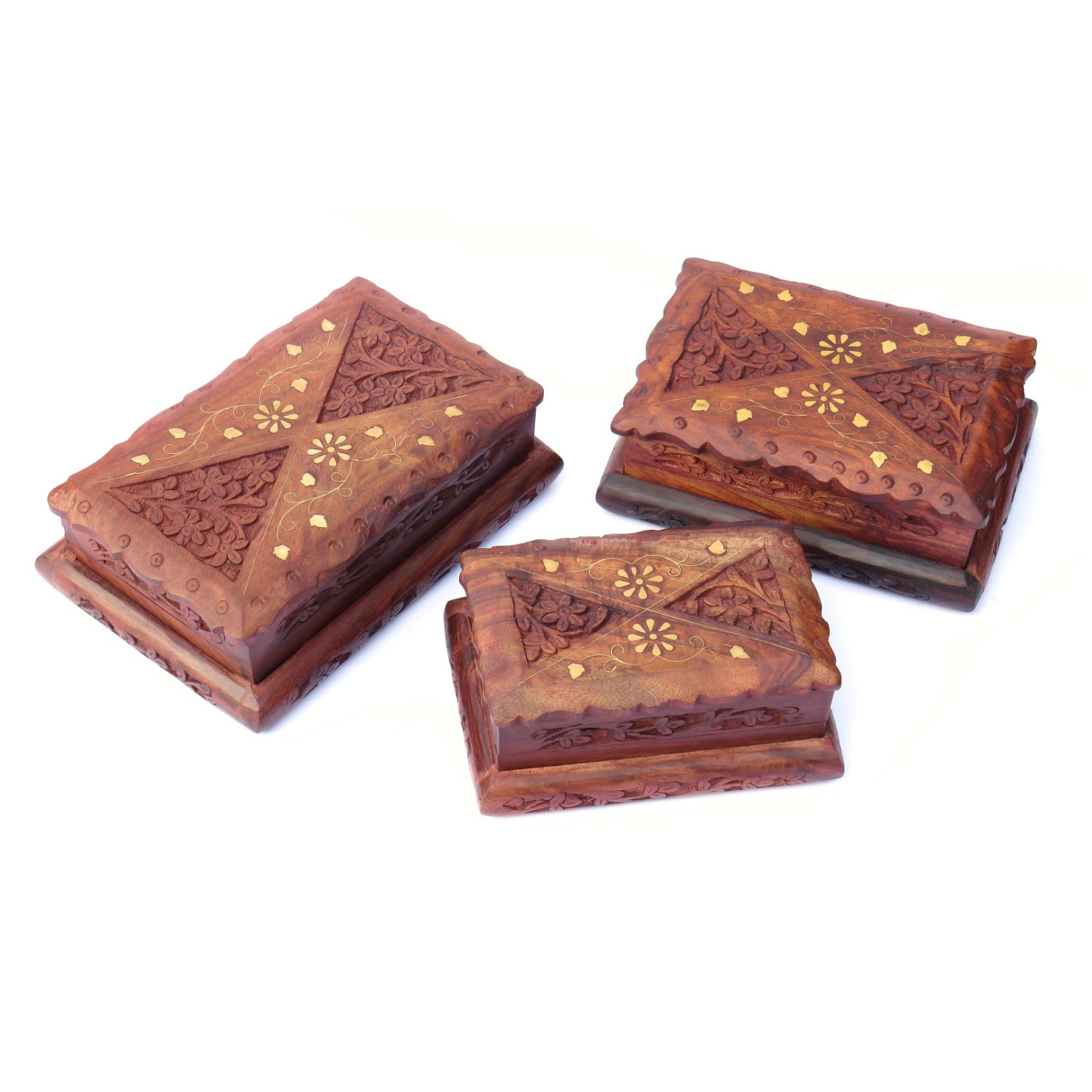 This set of 3 Sheesham wood framed boxes is beautifully handcrafted with detailed carving and brass inlay work, making them both functional and decorative. The antique-inspired design reflects traditional Indian craftsmanship, giving each box a unique charm.