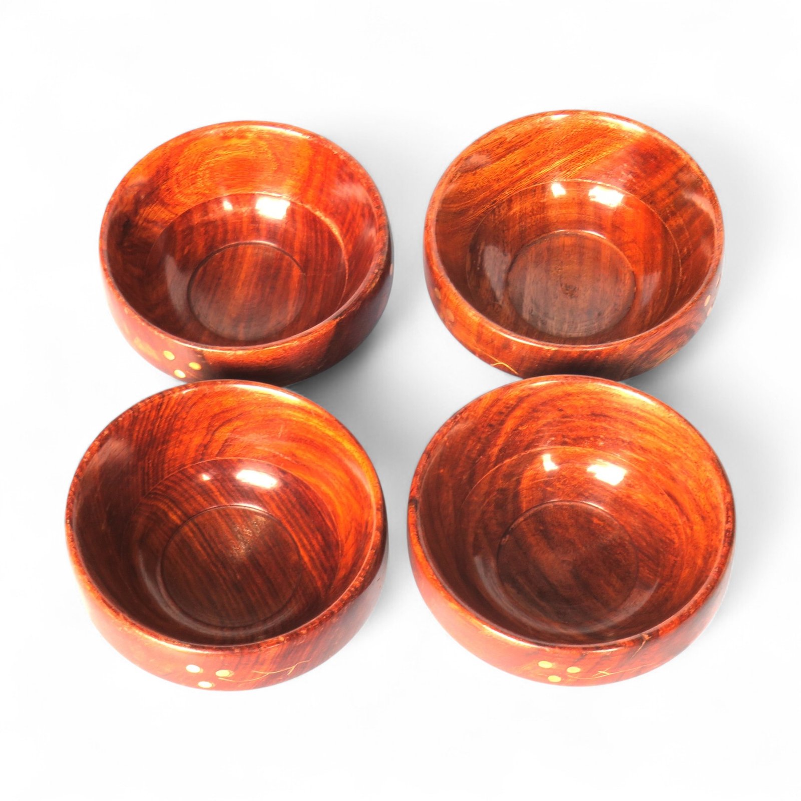 Elevate your serveware collection with these handcrafted Sheesham wood bowls featuring beautiful brass inlay designs. Measuring 4×2 inches, these bowls are perfect for serving dry fruits, candies, cookies, namkeens, or snacks in style.