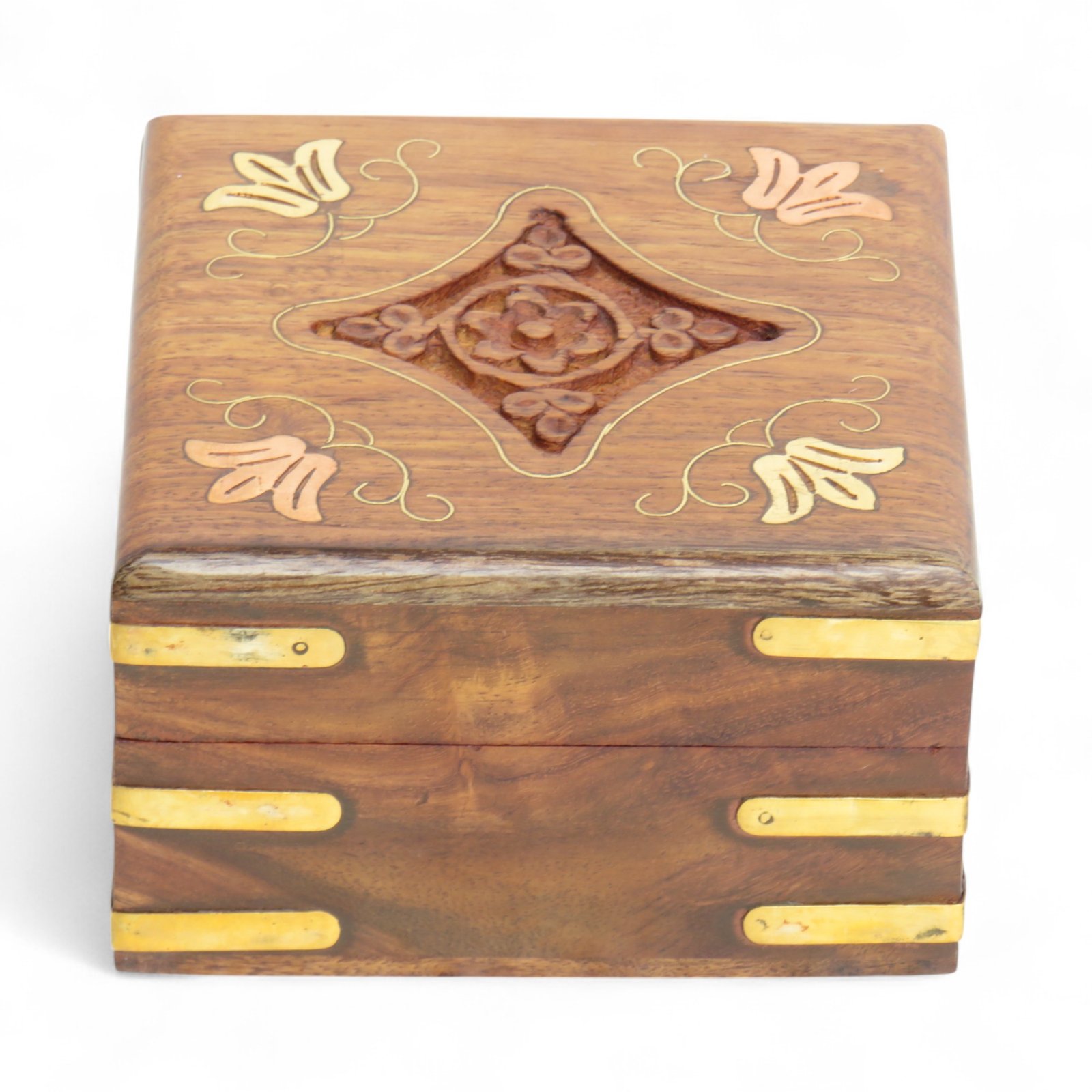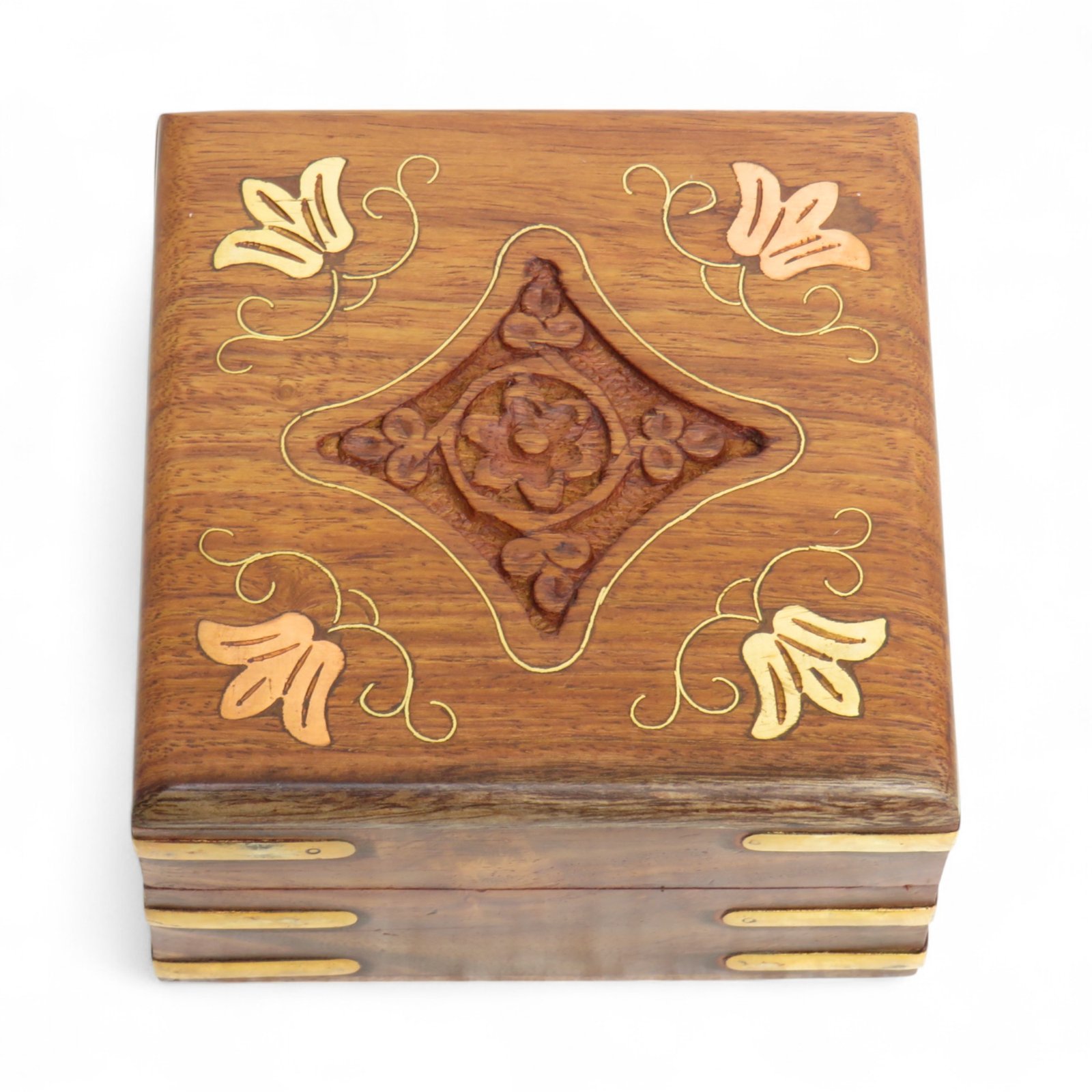 This Sheesham Wood Jewellery Box (4×4 inch) is a blend of tradition and functionality. Handcrafted by skilled artisans, it features detailed carving handicraft, copper inlay work, and brass corner fittings for extra elegance and durability.