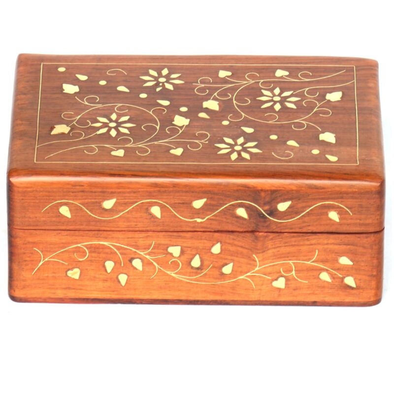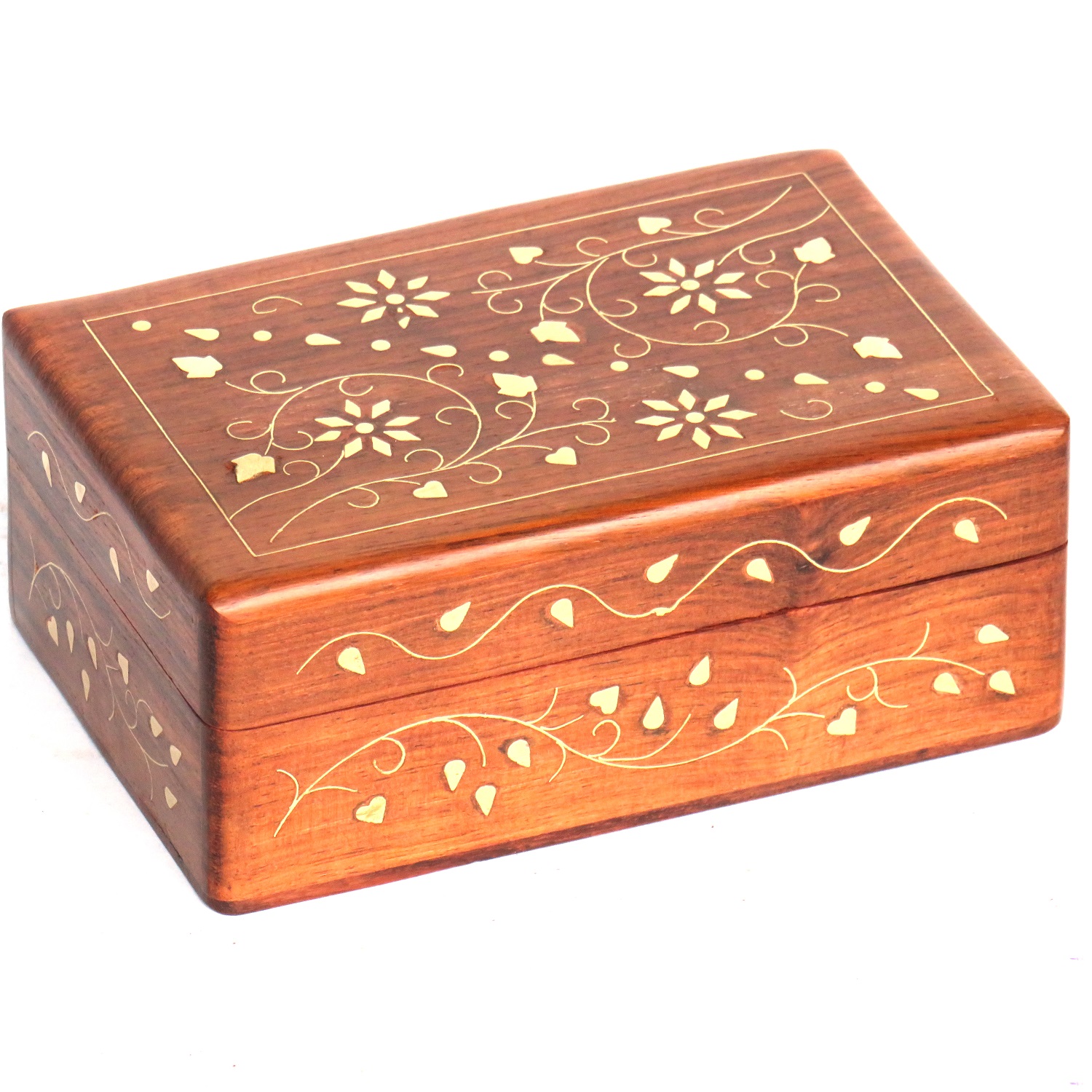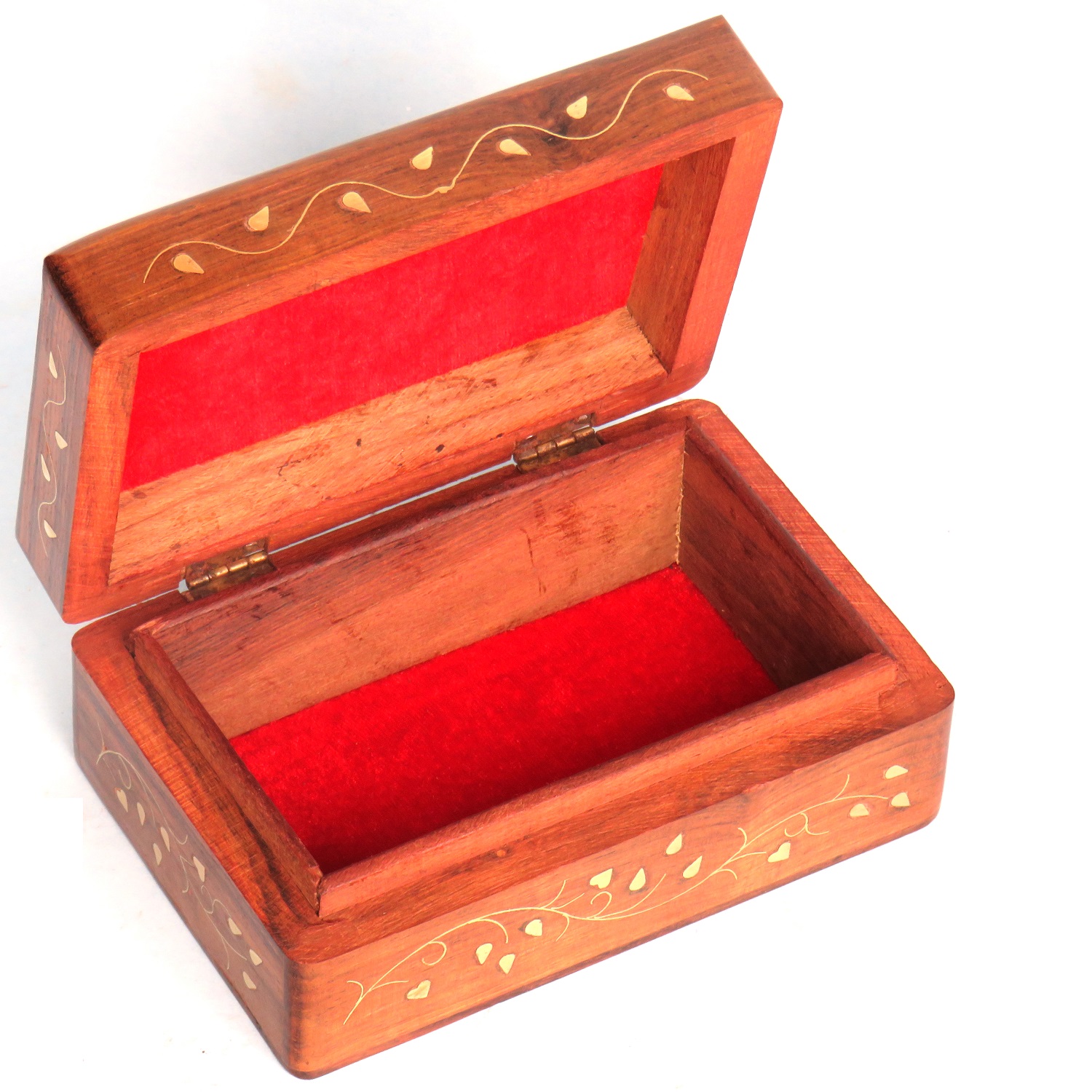 Enhance your collection with this Sheesham Wood Jewellery Box featuring full brass inlay handwork. Measuring 6×4 inches, it is compact yet spacious enough to store jewellery, keepsakes, trinkets, or small valuables.