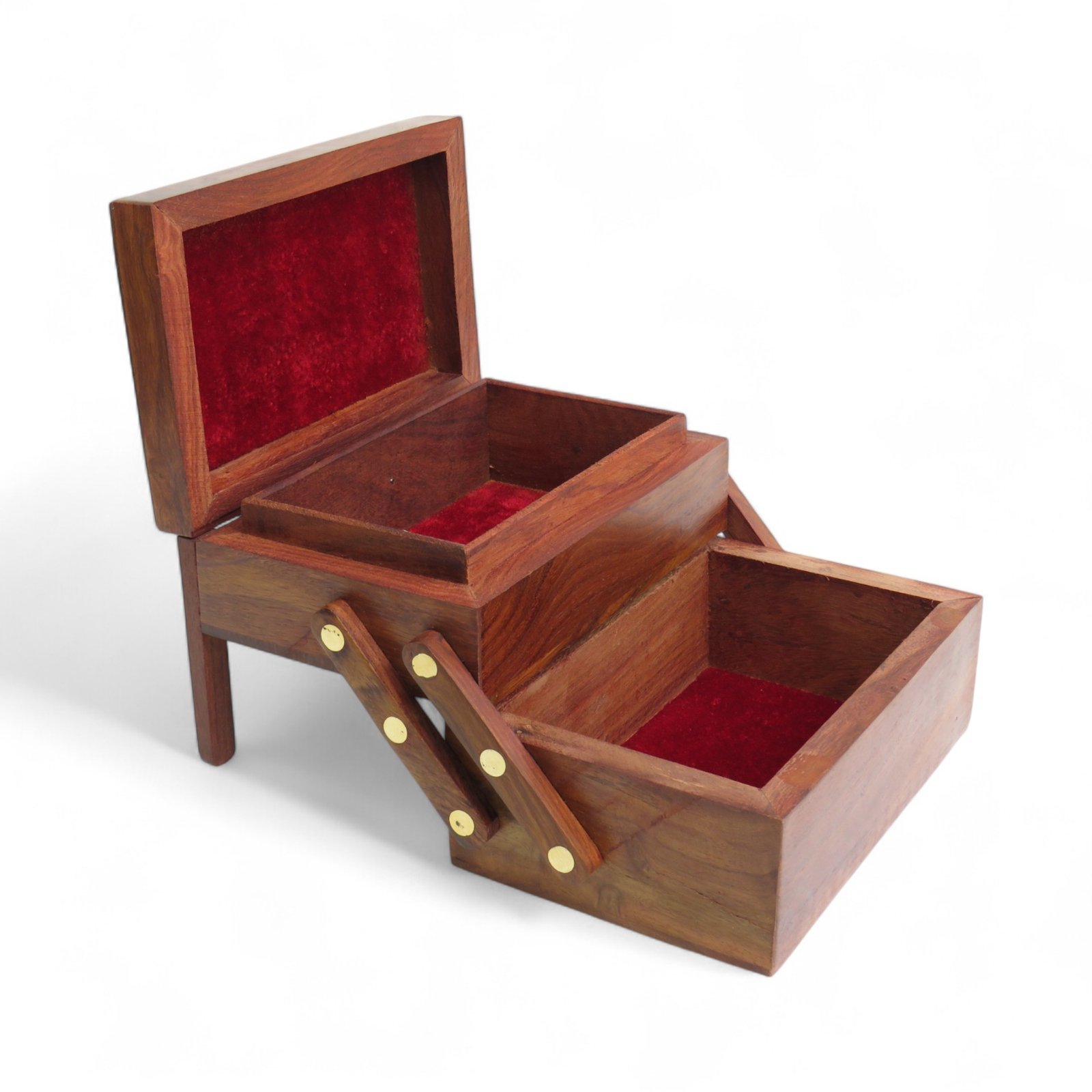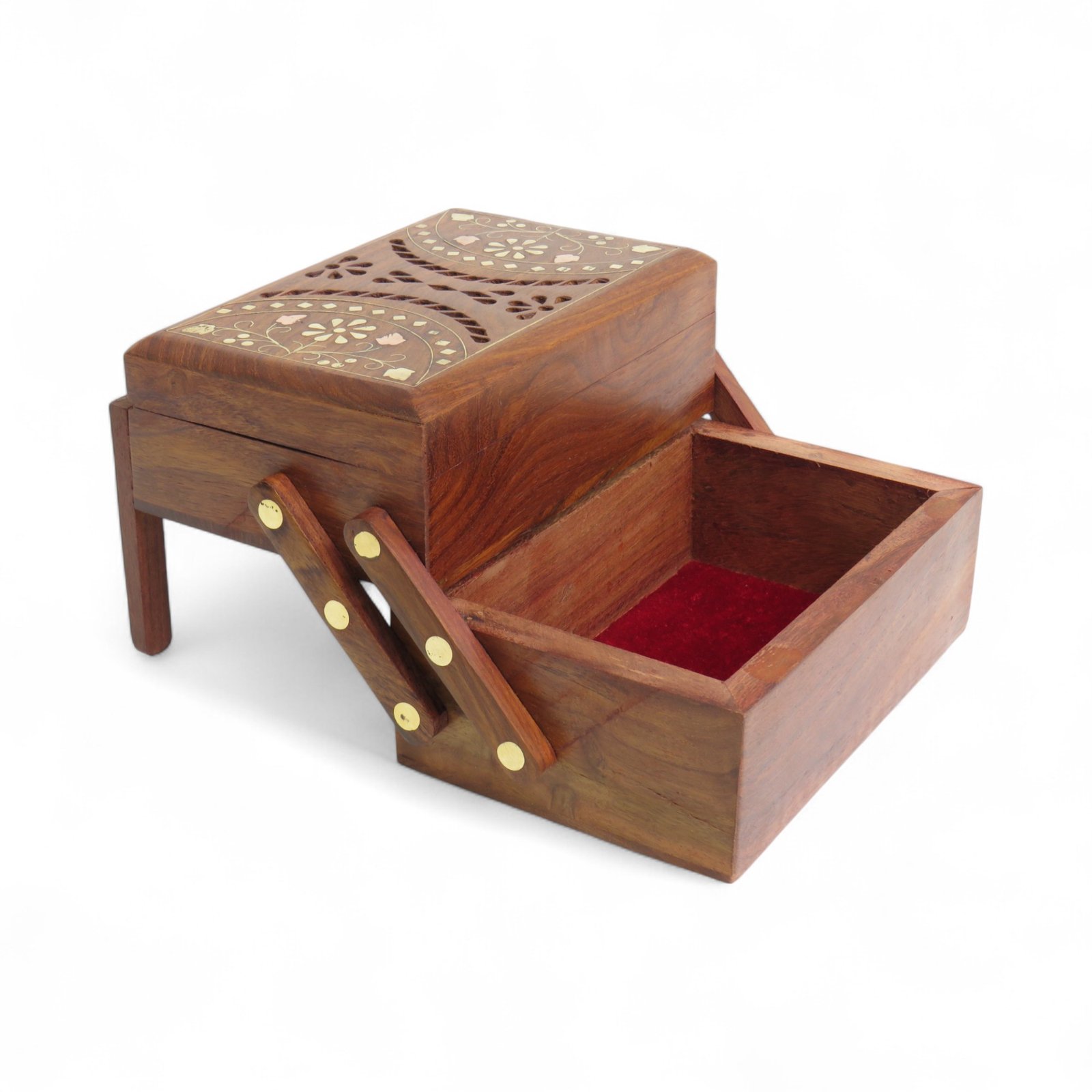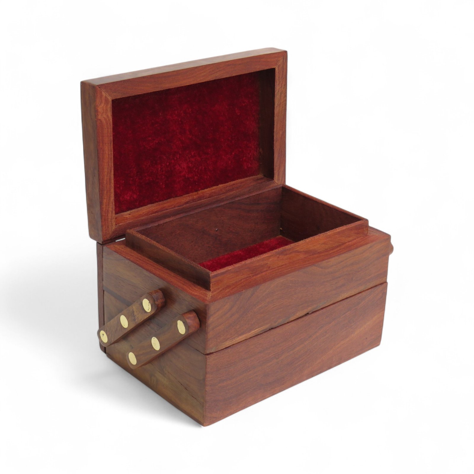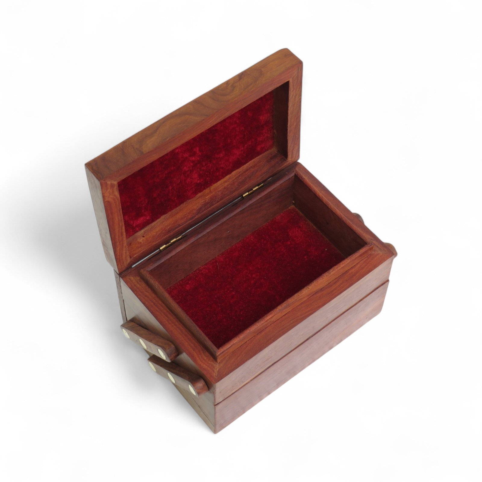 Add elegance to your collection with this Sheesham Wood Jewellery Step Box. Crafted by skilled artisans, this box features a unique sliding step design that allows easy access while keeping your valuables safe.