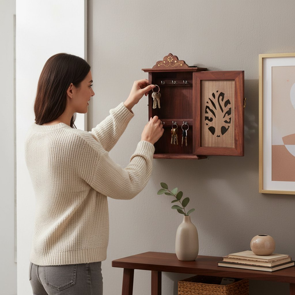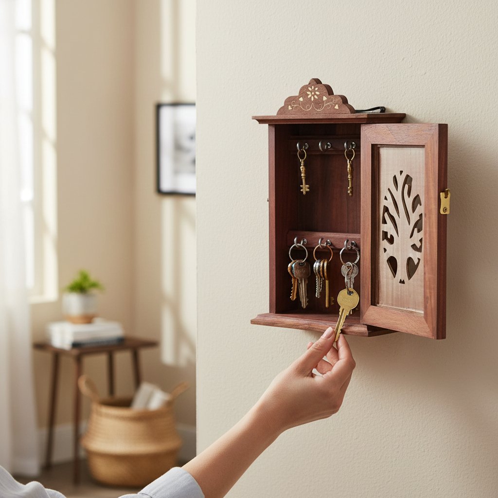 This wooden key holder box combines functionality with artistic craftsmanship, making it a perfect addition to traditional and modern interiors. It also serves as a thoughtful gift for housewarming, festive occasions, and home décor lovers.