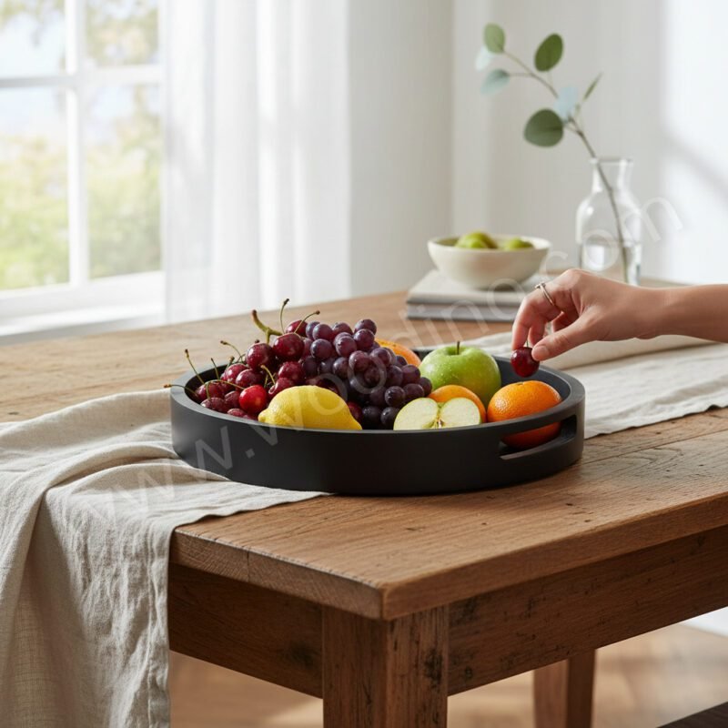 The round shape with inbuilt handles makes it easy to carry and perfect for serving fruits, snacks, tea/coffee, and other items neatly. It also works beautifully as a makeup kit organizer tray for parlours, salons, vanity tables, and restaurants where clean presentation matters.