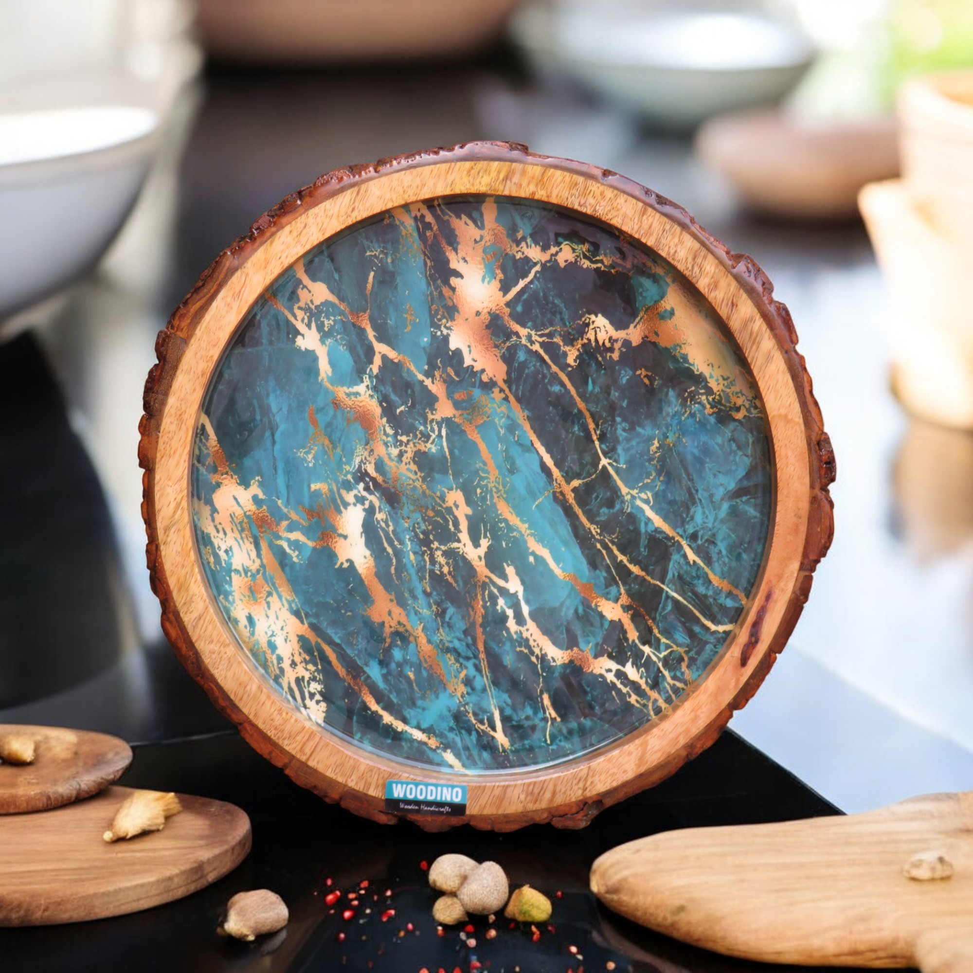 Bring elegance and craftsmanship together with the Woodino Circular Epoxy Resin Bark Mango Wood Serving Platter. Measuring 12 inches in diameter, this round wooden tray showcases a stunning blue marble texture art print sealed in glossy epoxy resin.