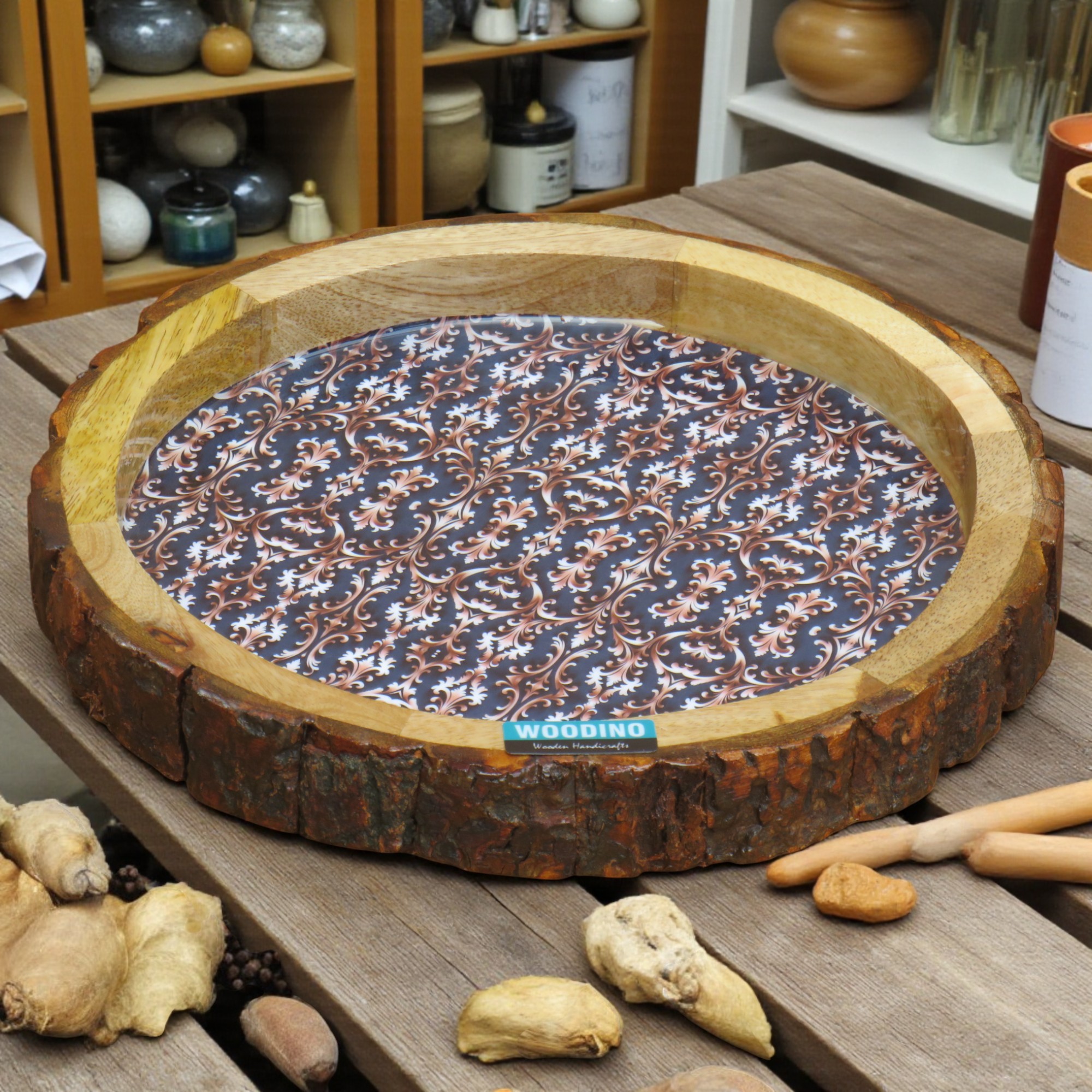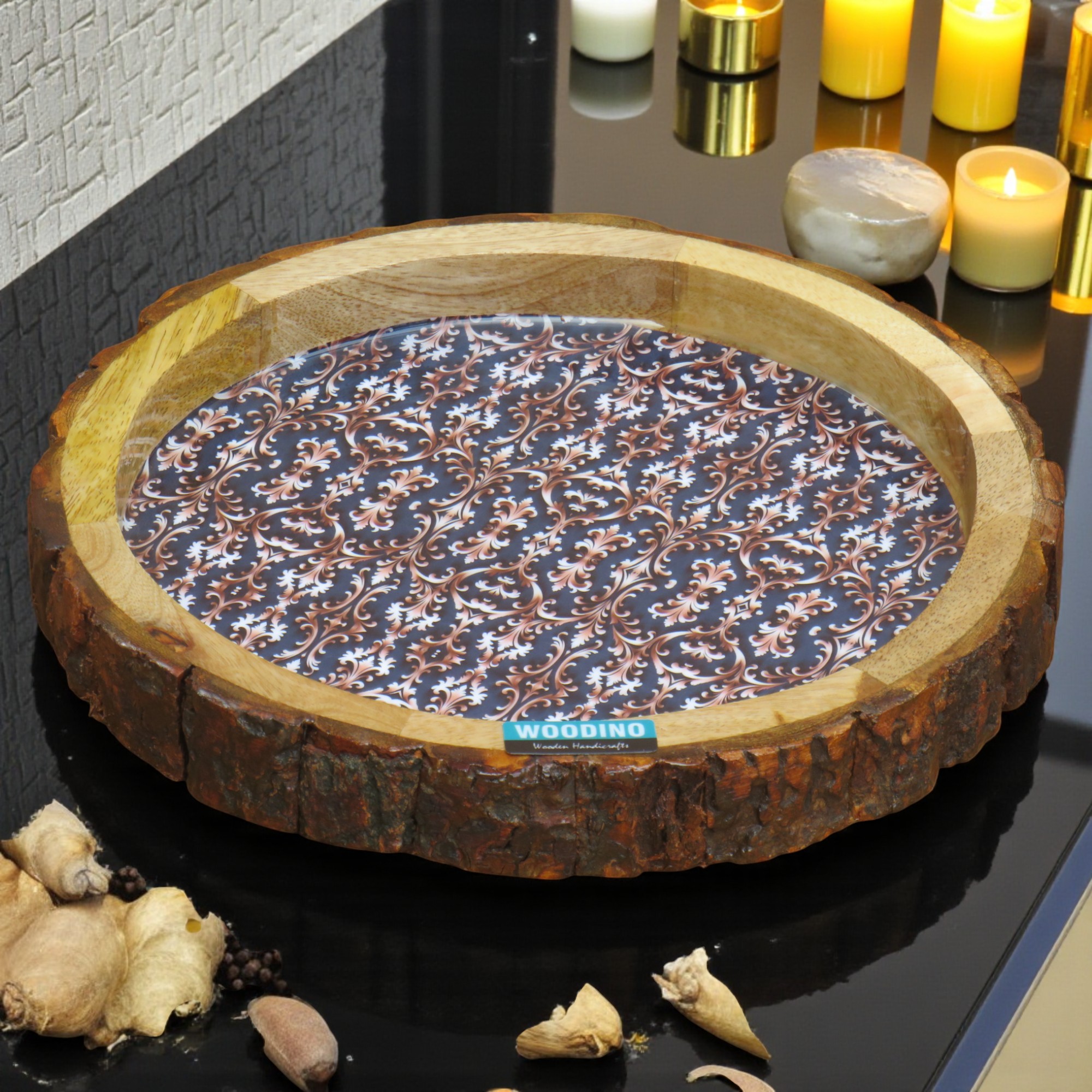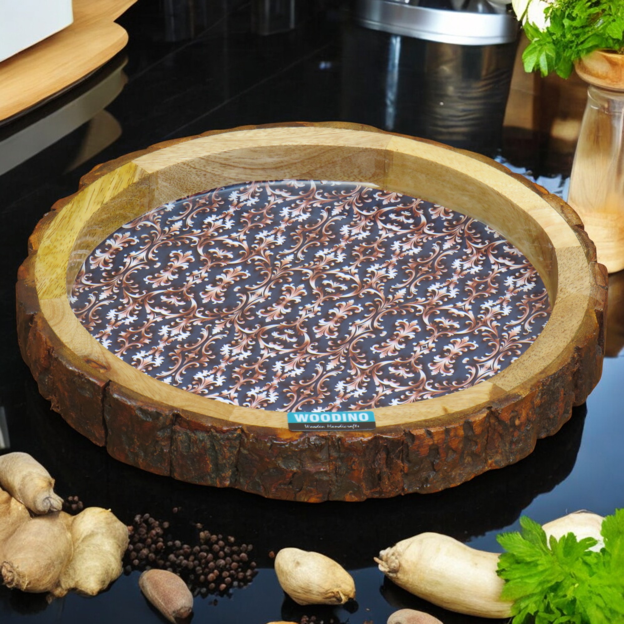 Woodino Circular Resin Beautiful Pattern Mango Wood Serving Platter – Multipurpose Tray for Snacks, ( Size: 10") Black Theme