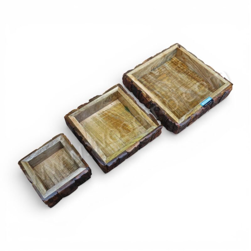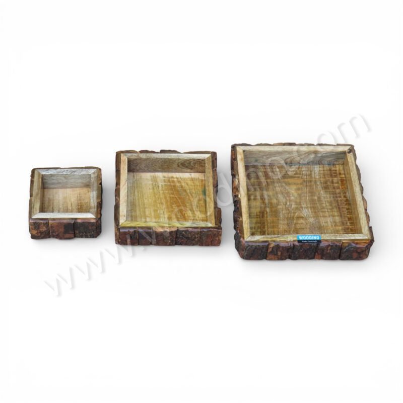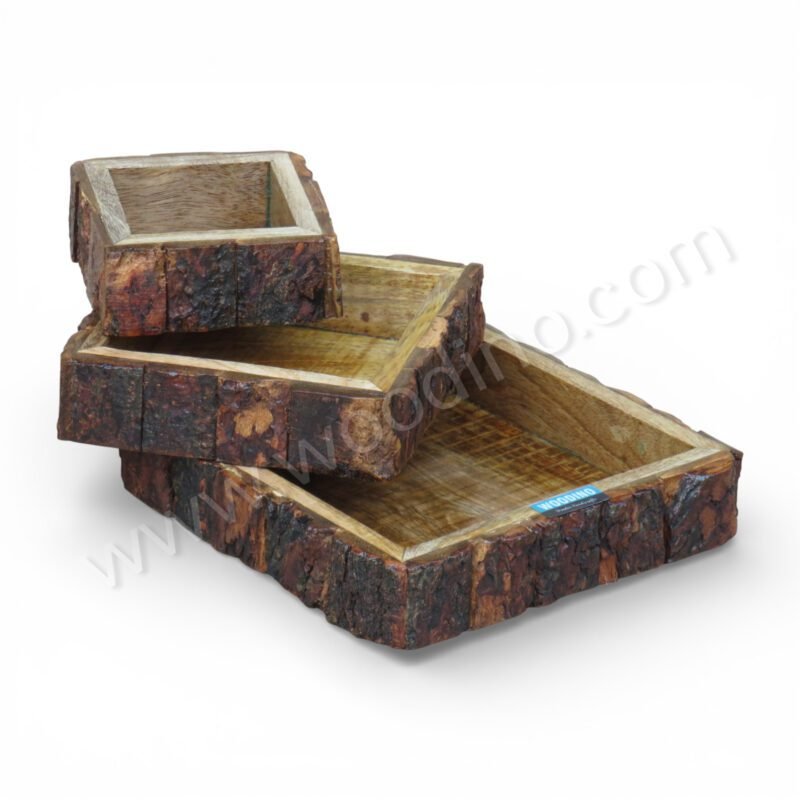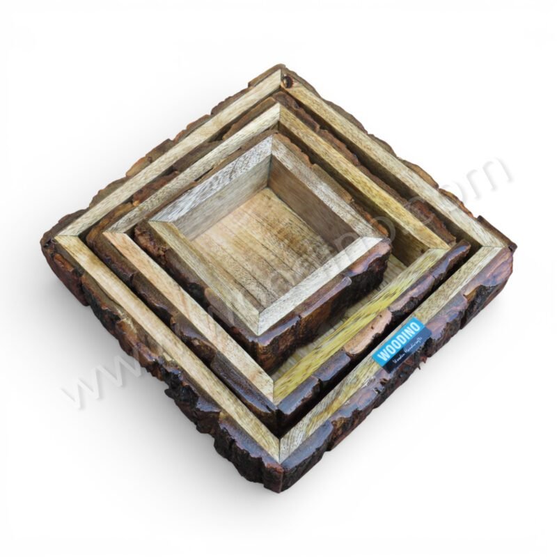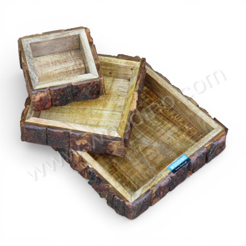 Add a natural handcrafted charm to your serving and décor with the Woodino Mango Wood Logs Square Bowl & Serving Platter Set of 3. Crafted from premium mango wood in a Chhal / Bakkal / Logs / Bark design, this square bowl set brings a rustic yet elegant look to your dining table and gifting collections.