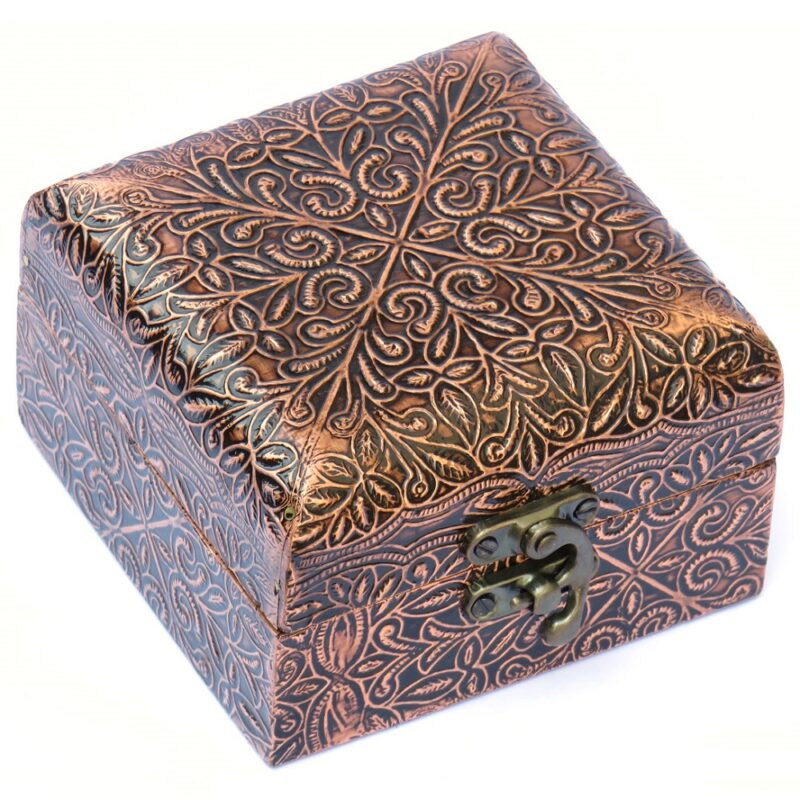 Made with durable MDF wood base and finished with hand-beaten copper metal sheet, it blends durability with tradition. A timeless piece of artisanal craftsmanship, this small yet stylish box is a must-have for every home.