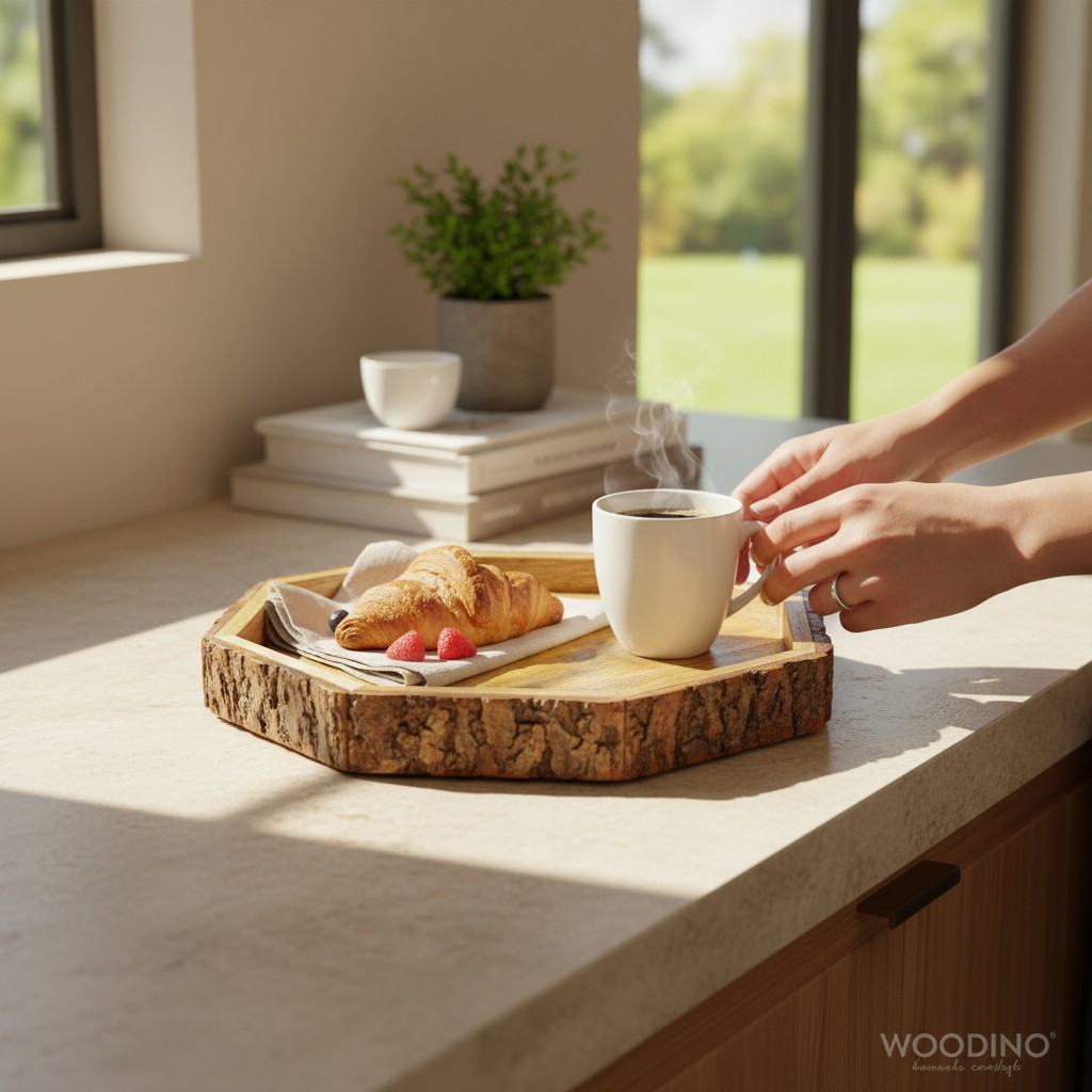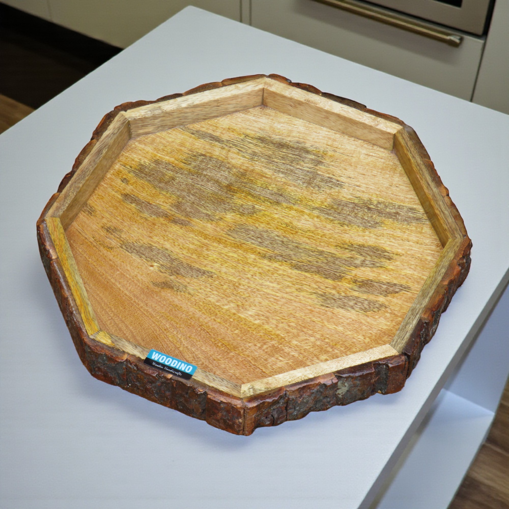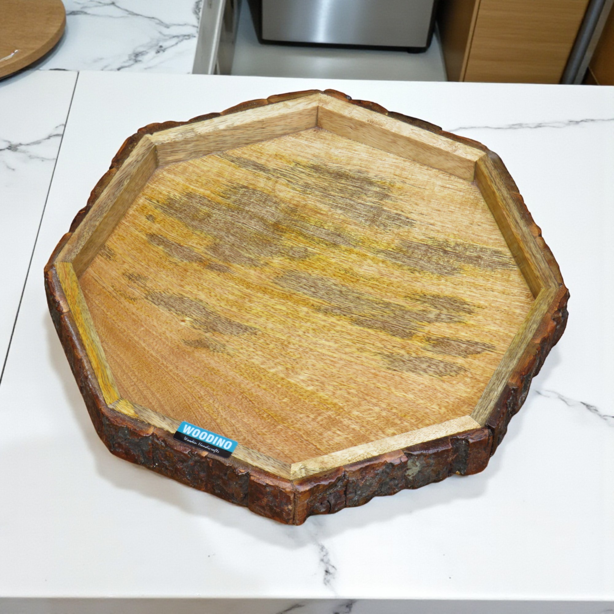Upgrade your dining experience with the Woodino Octagon Mango Wood Bark Serving Platter — a handcrafted masterpiece designed for both beauty and utility. Measuring 13 inches, this platter features a unique octagonal shape that stands out in any serving setup.