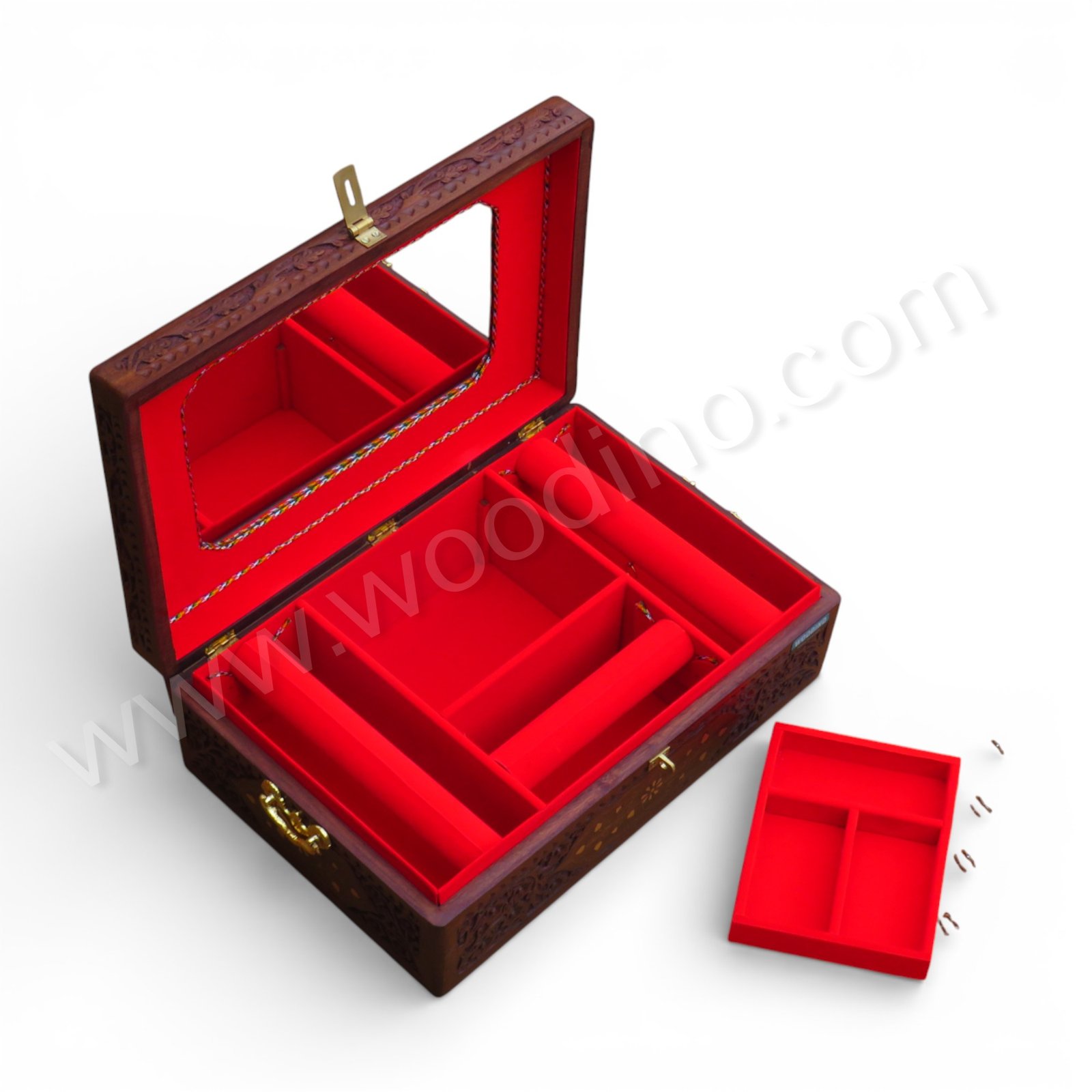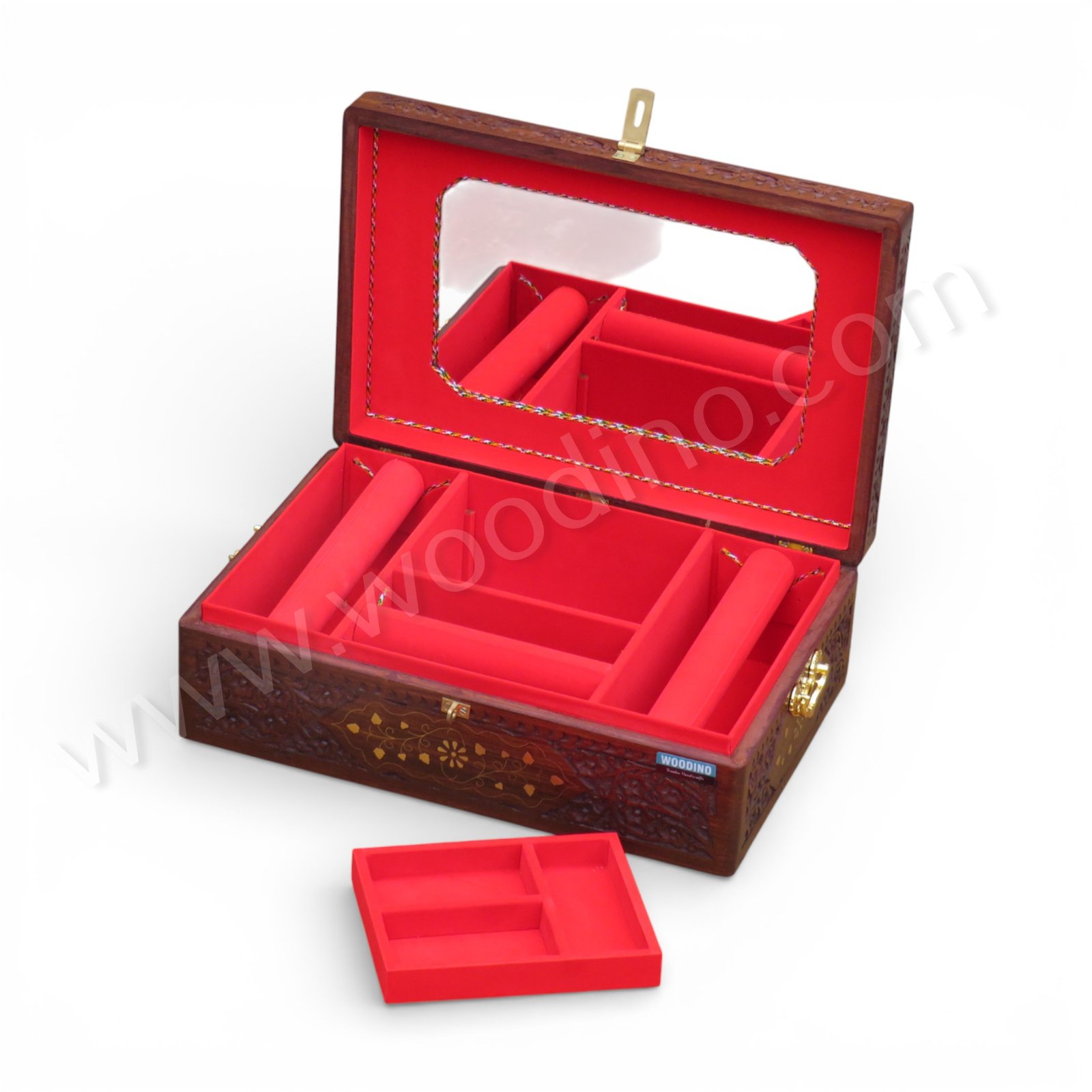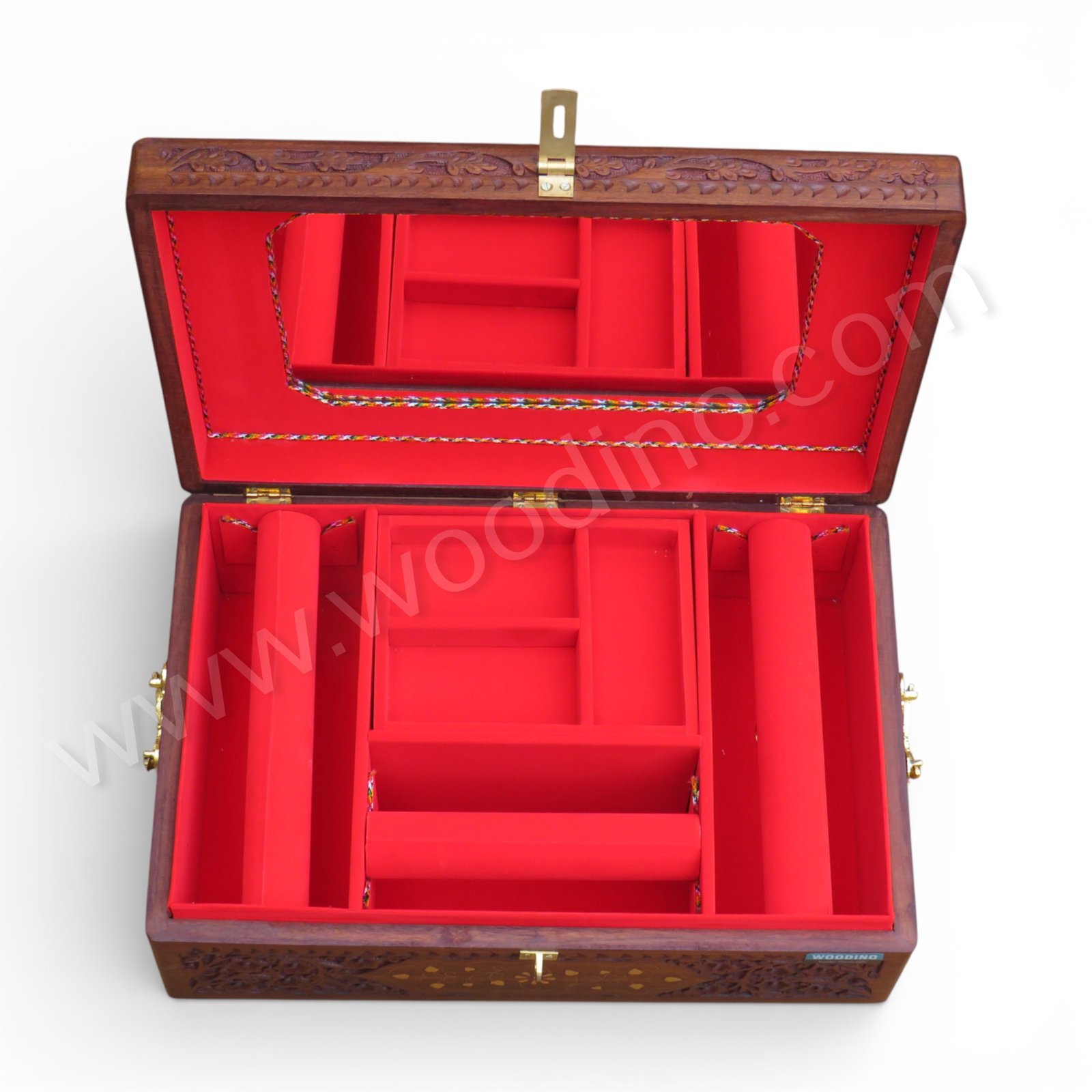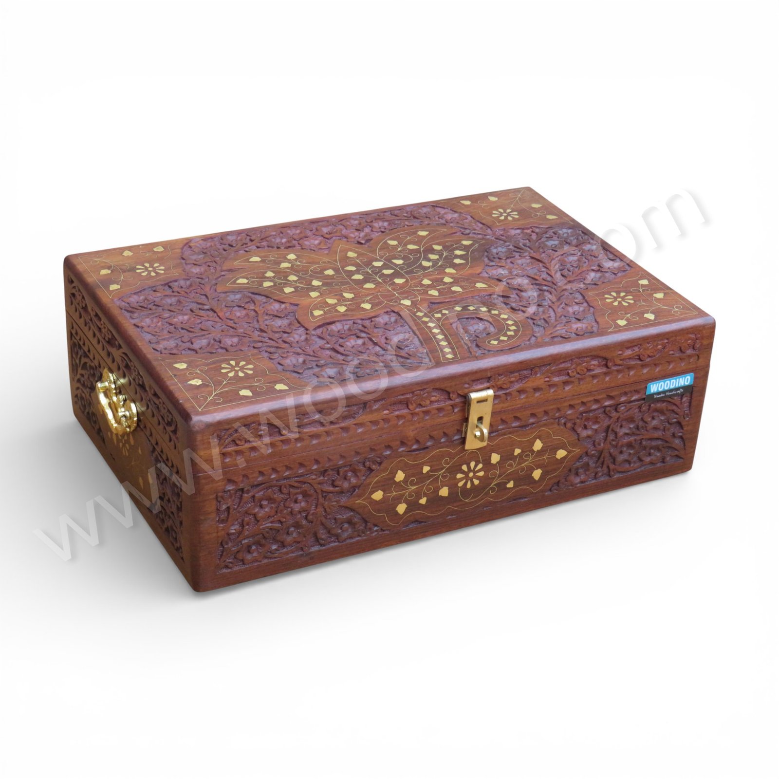 Store your precious jewellery in a truly royal and traditional way with the Woodino Pure Sheesham Wood Jewellery Box, handcrafted with heavy brass inlay work and fine carving handicraft detailing. Made from 100% pure solid sheesham wood, this premium jewellery organizer offers a rich vintage look while keeping your valuables safe, clean, and well-arranged.