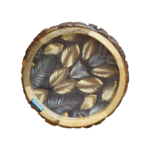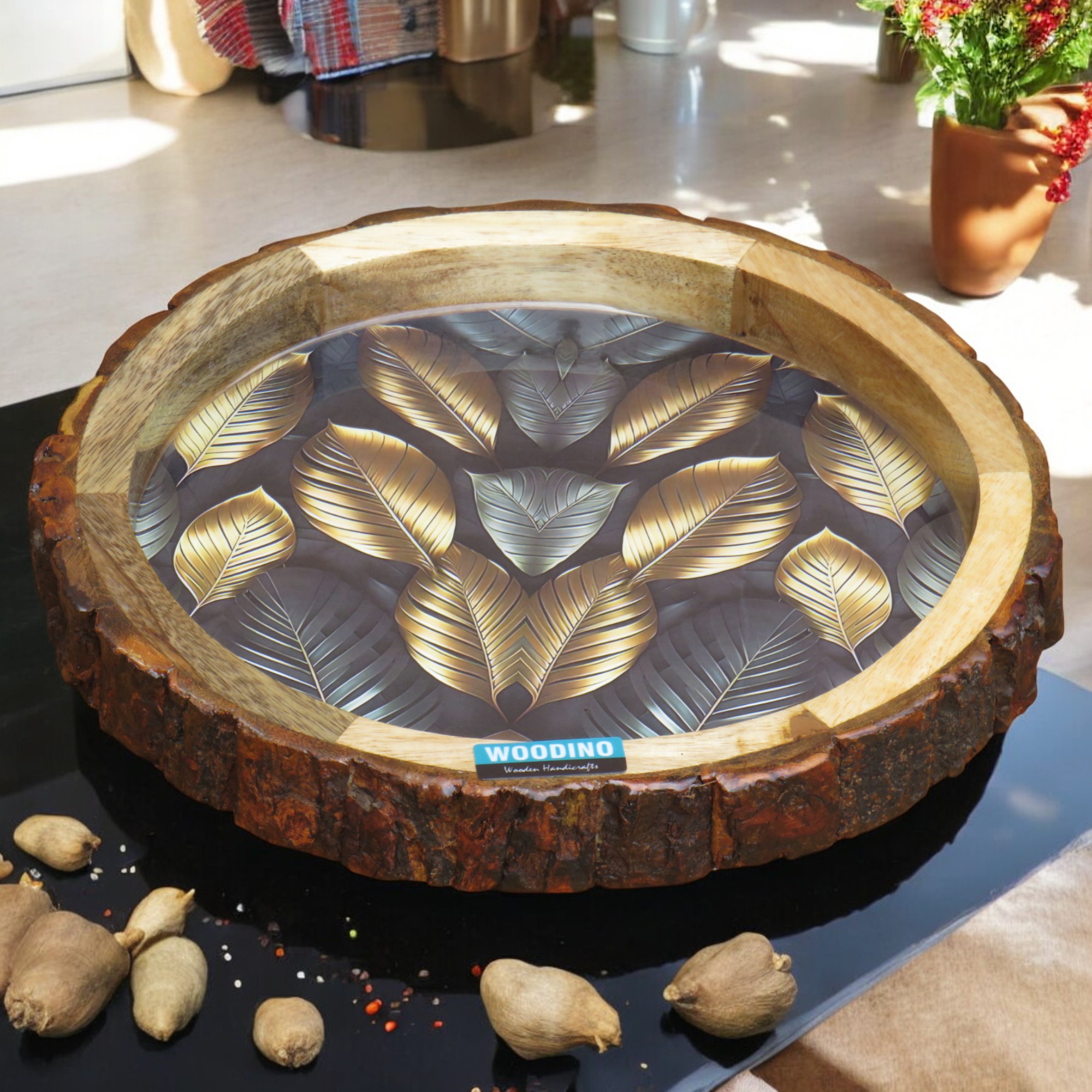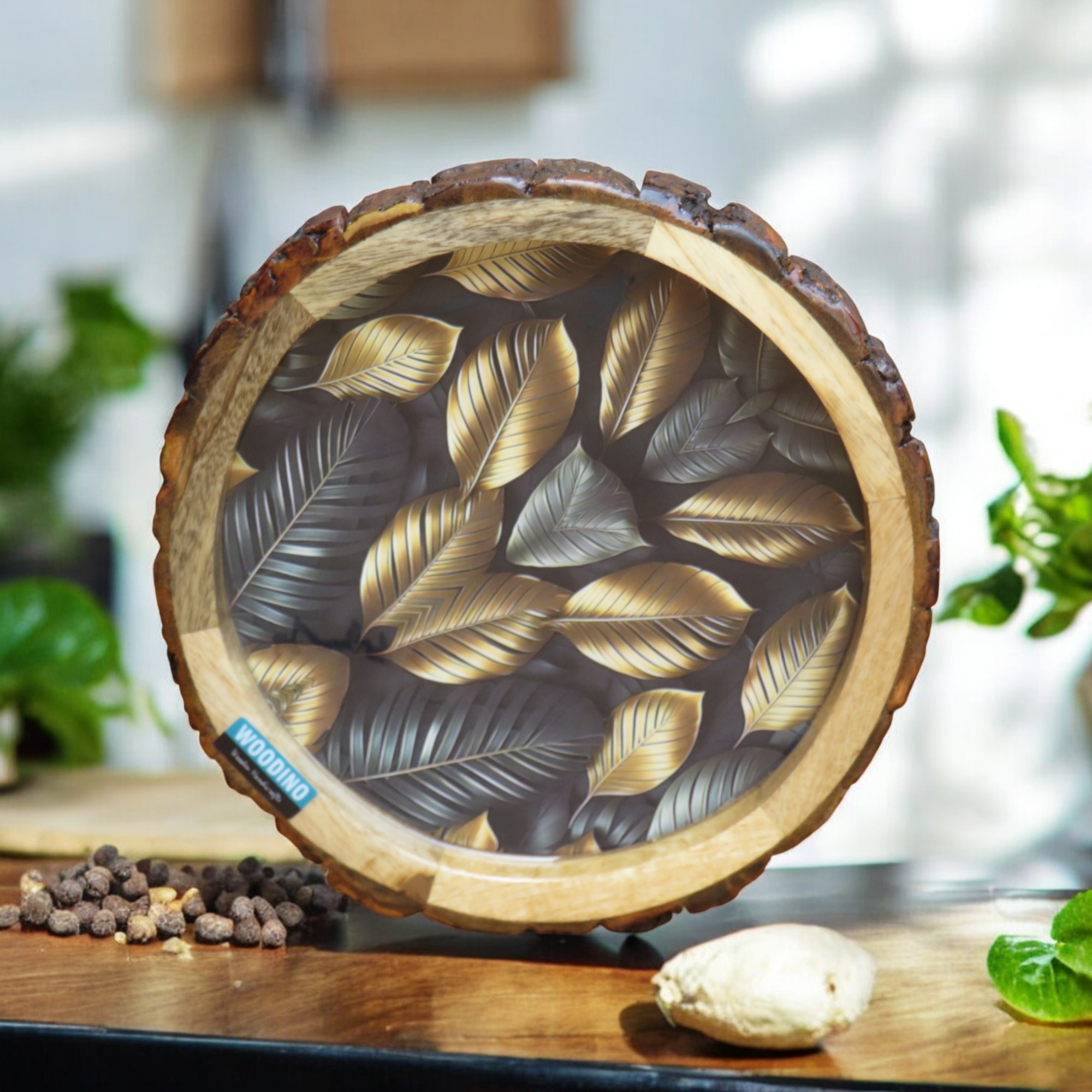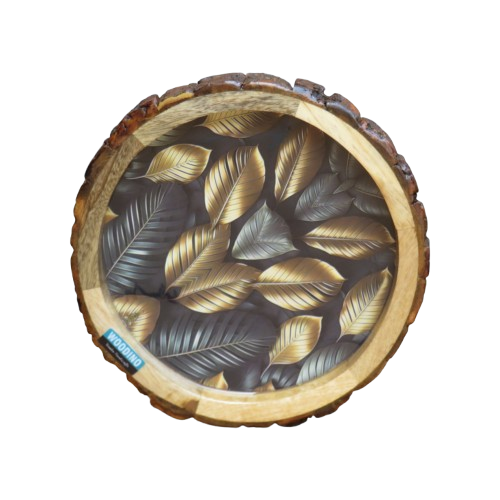 Woodino Round Epoxy Resin Mango Wood Serving Chhal Platter – Multipurpose Tray for Snacks, ( Size: 10″) Black Leaves