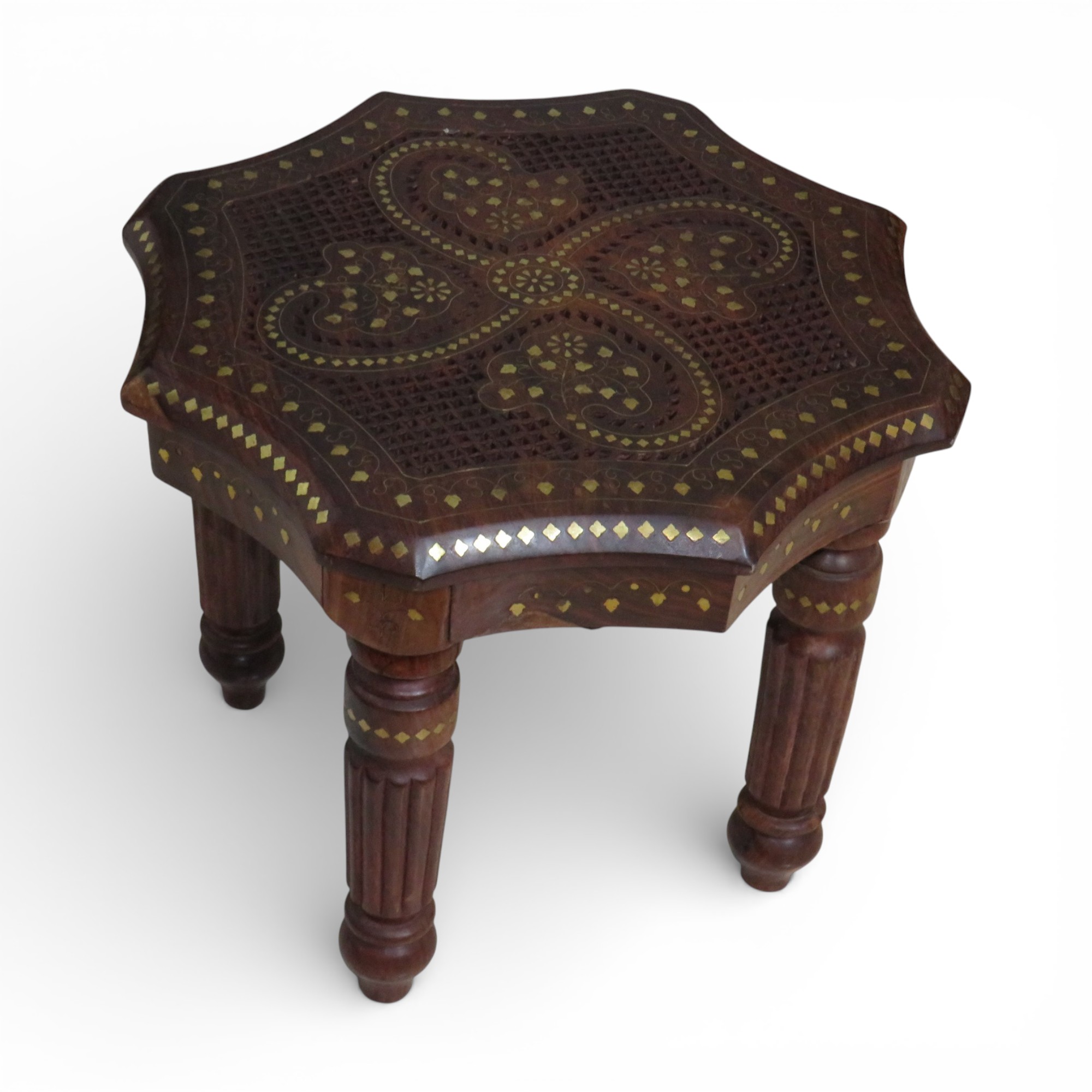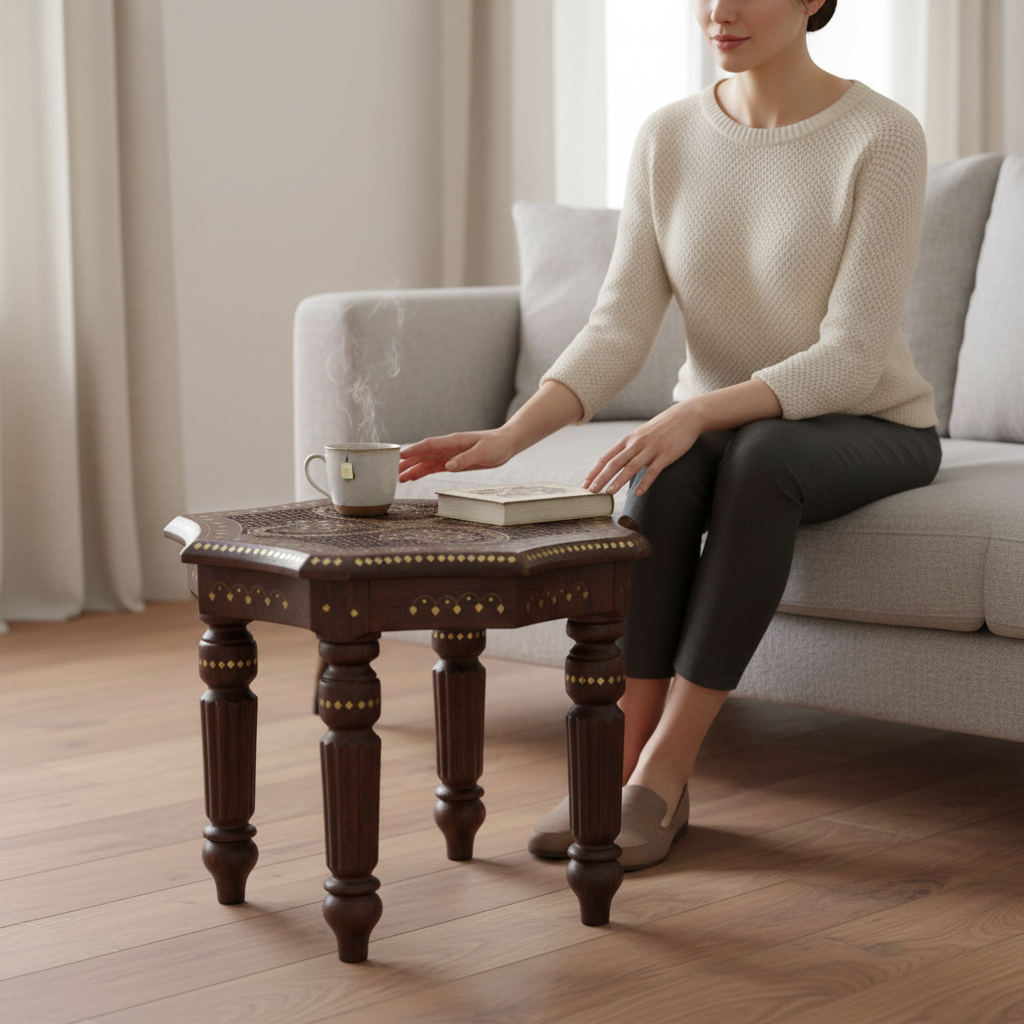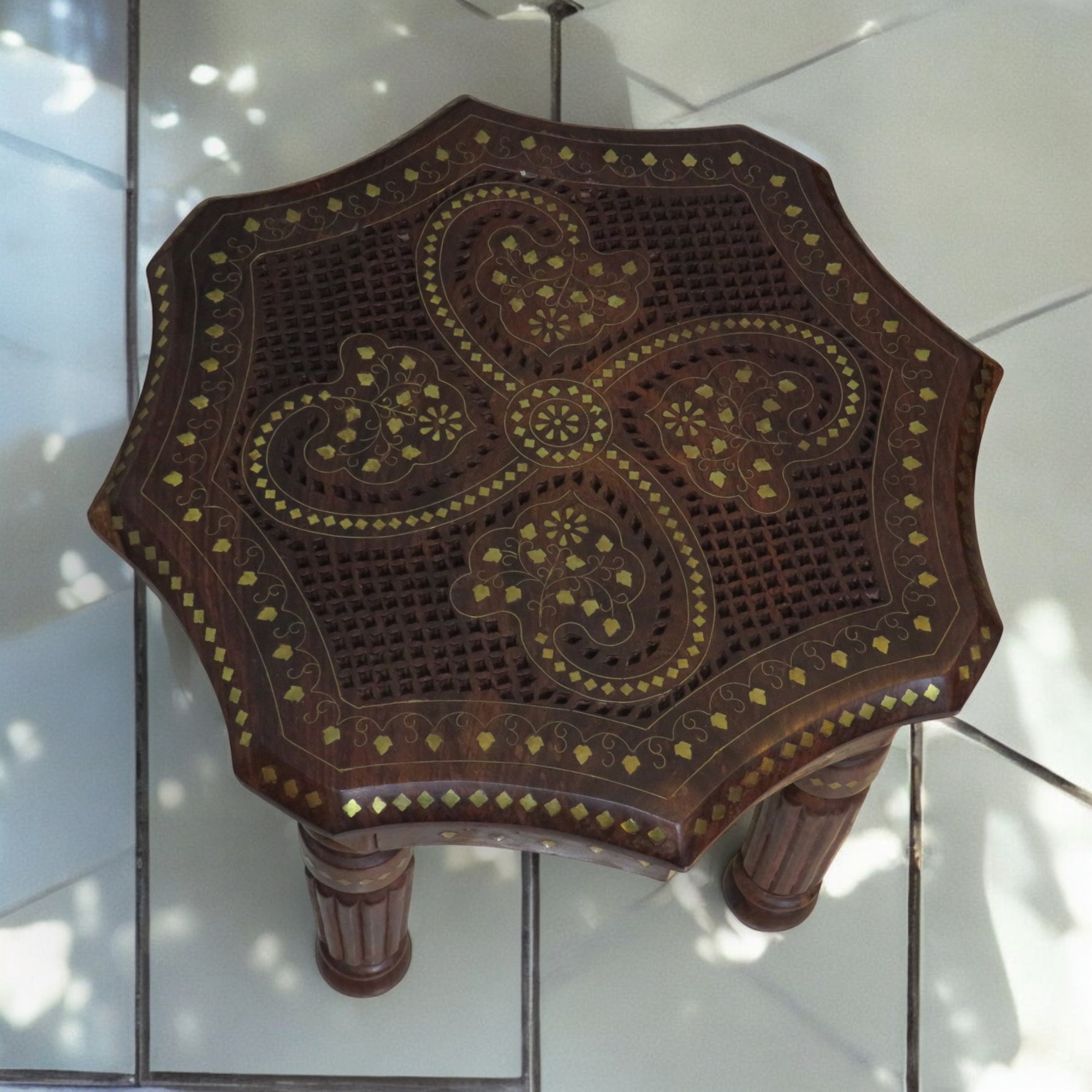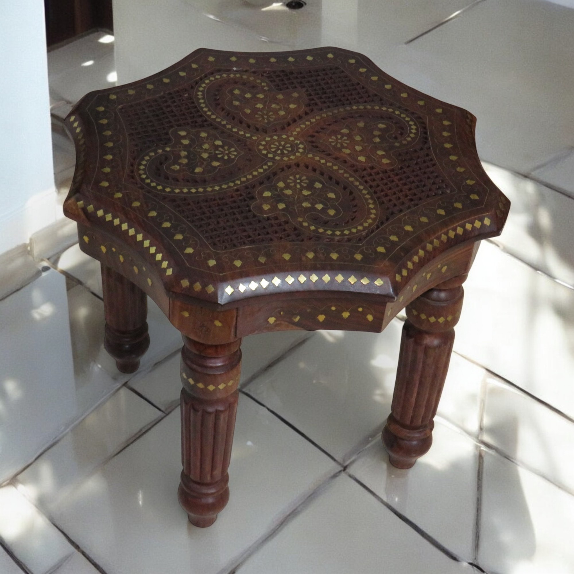 Bring extraordinary luxury and traditional Indian craftsmanship into your home with the Woodino Sheesham Wood Pure Brass Inlay Octa Stool / End Table. Beautifully handcrafted from pure solid sheesham wood, this premium piece features heavy brass inlay handicraft work along with elegant jaali/net handwork, creating a rich vintage and royal look.