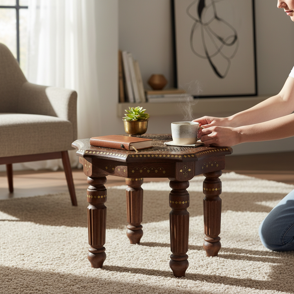 Designed to be compact yet highly useful, it works perfectly as a wooden stool, side end table, accent table, or compact coffee table. The premium smooth finishing enhances the natural beauty of sheesham wood while giving the product a refined luxury feel for modern and traditional interiors alike.