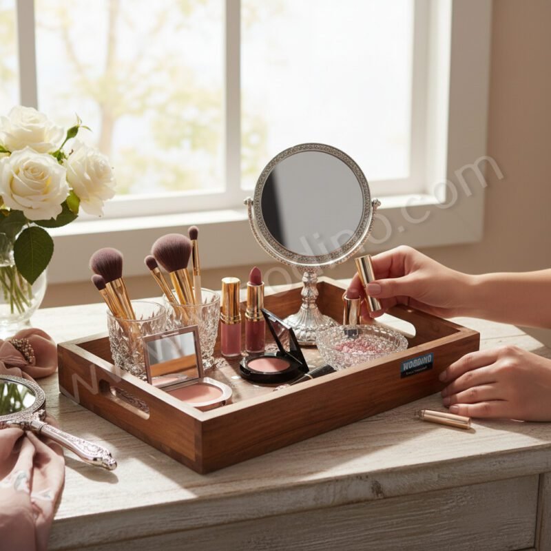 Designed for versatility, it works perfectly as a coffee tray for cups and mugs, a fruits tray for dining tables, and a makeup kit organizer for dressing tables, parlours, or salons. The strong build and smooth premium polish ensure durability for daily use at home as well as professional environments like cafés, hotels, and lounges.