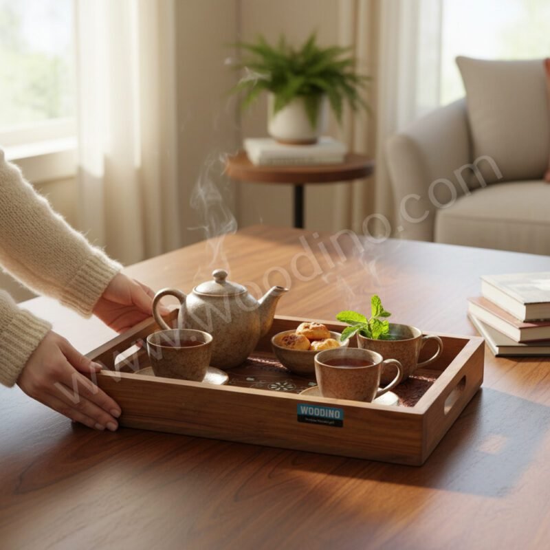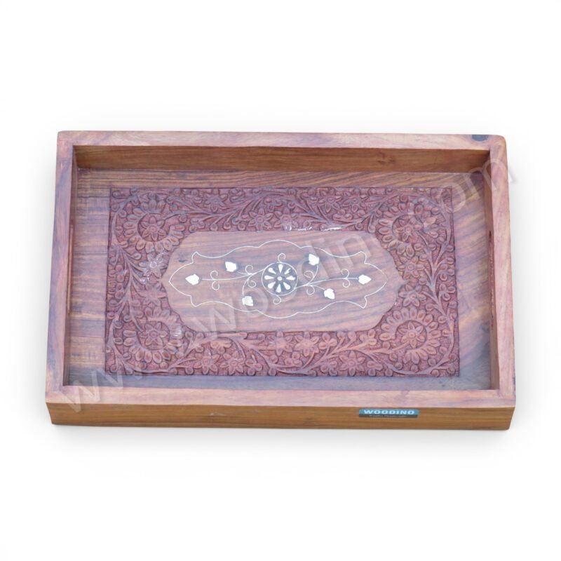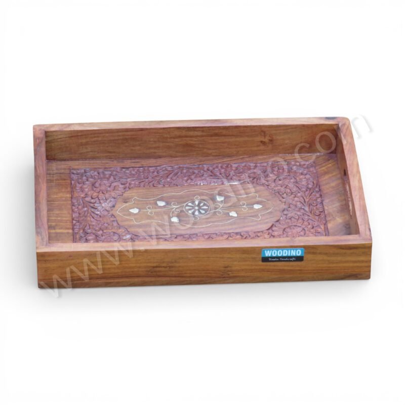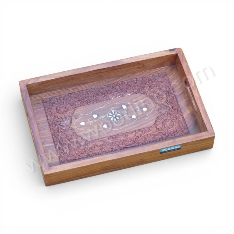 Serve and organize with timeless elegance using the Woodino Sheesham Wood Carved Serving Tray with Brass Inlay (12×8 Inch). Handcrafted from solid sheesham wood (Indian Rosewood), this heavy and sturdy tray features fine carving work complemented by premium brass inlay, giving it a rich traditional yet luxurious appeal.