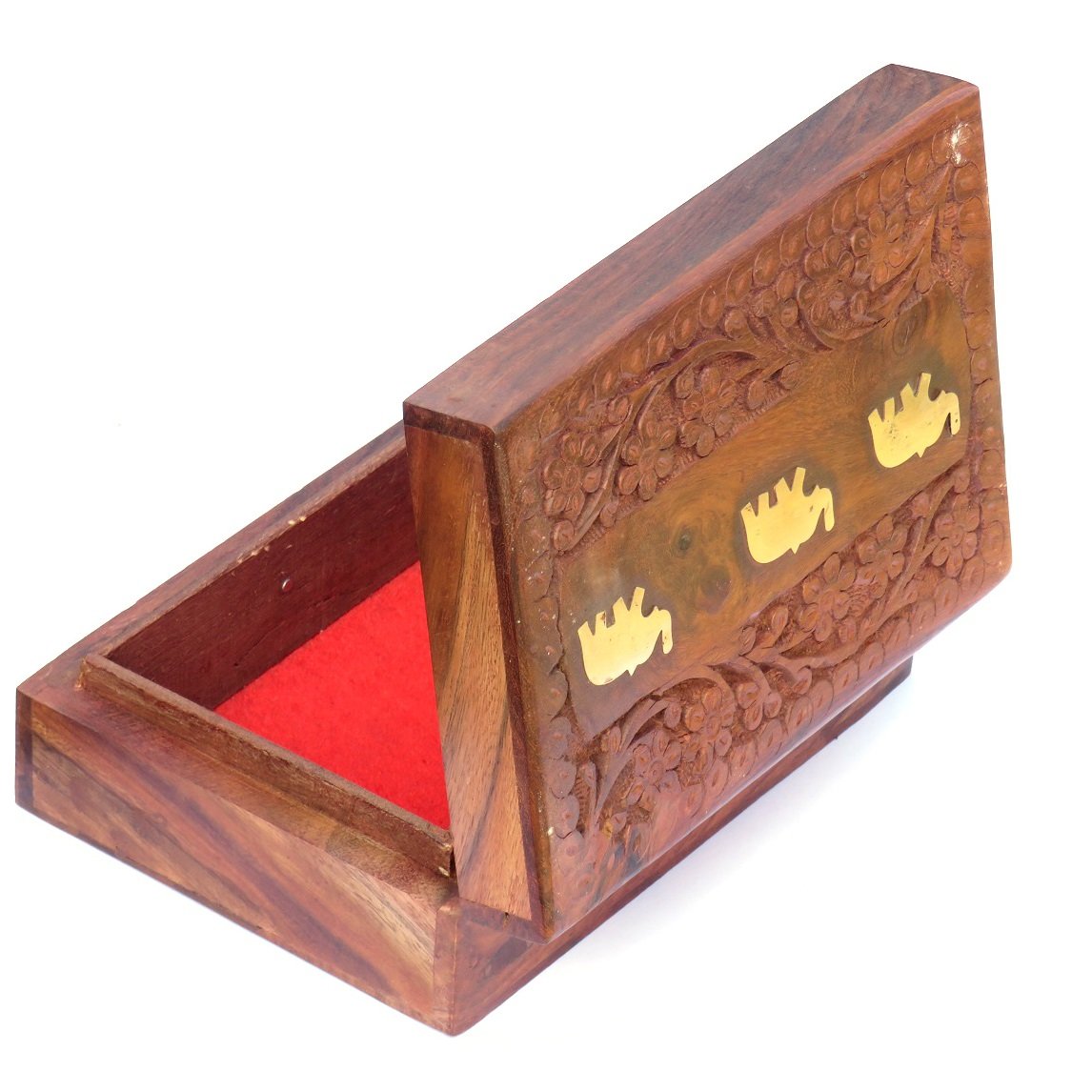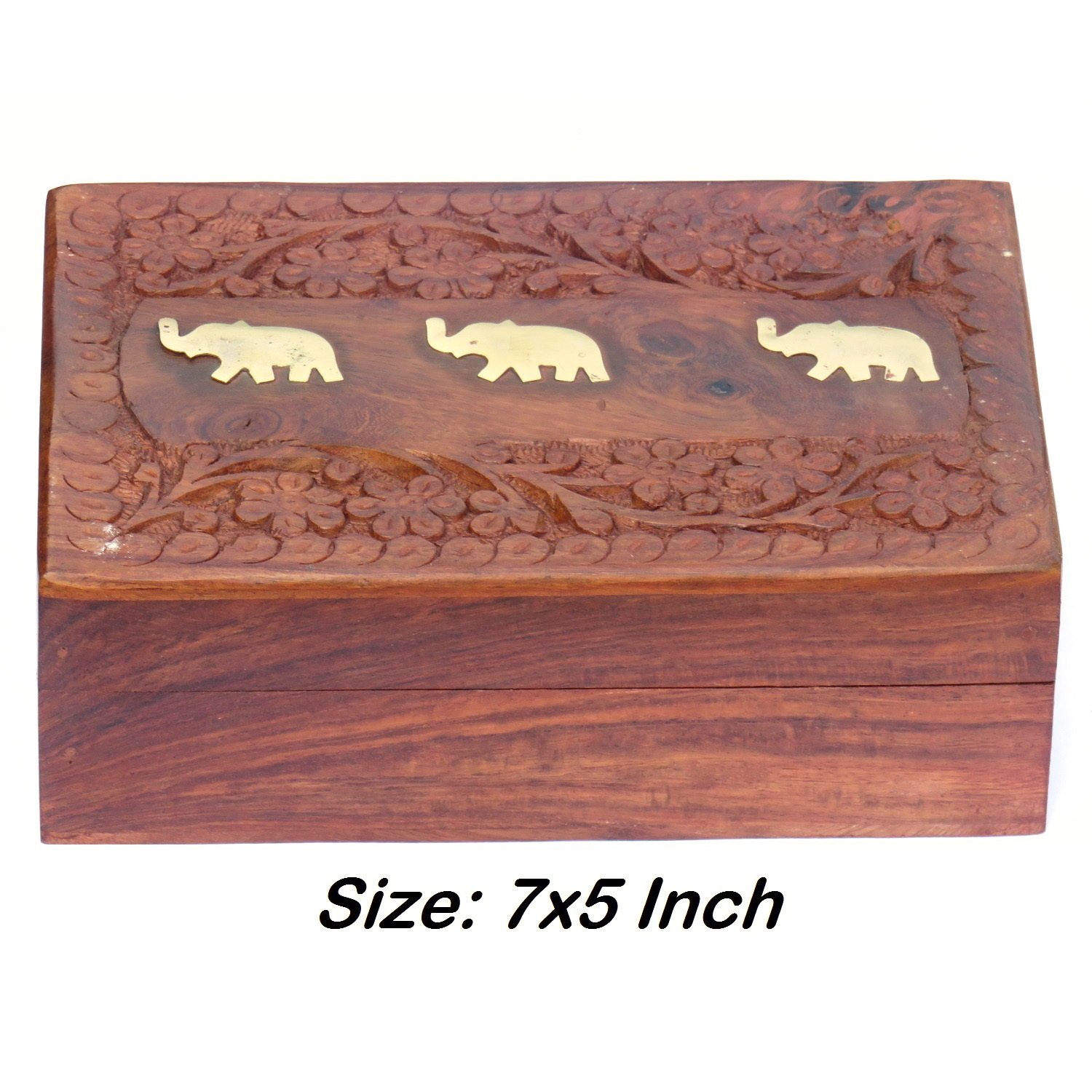 This Woodino Sheesham Wood Jewellery Box is a fine example of skilled craftsmanship with 3 elephant brass inlay work and detailed carving around the box. Measuring 7×5 inches, it offers ample space for jewellery, trinkets, and small valuables while adding elegance to your dresser or home décor.