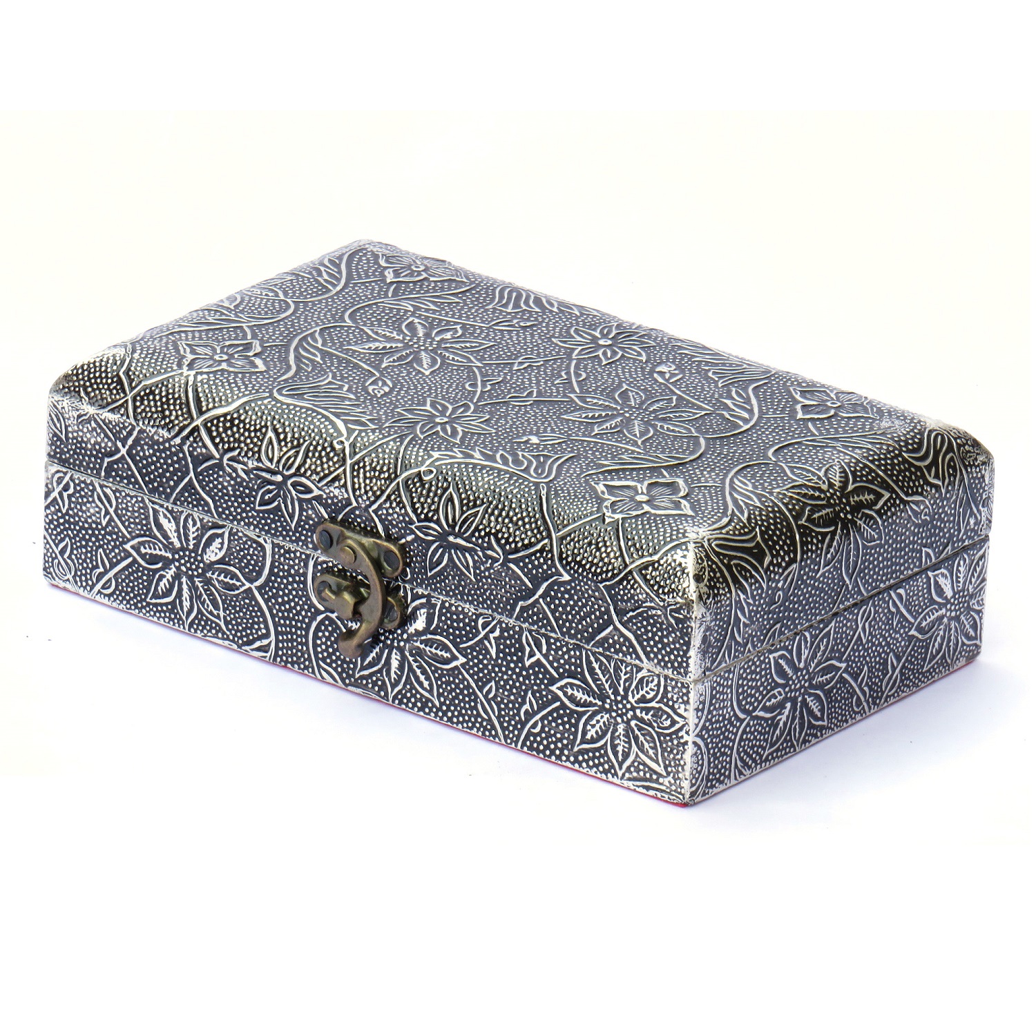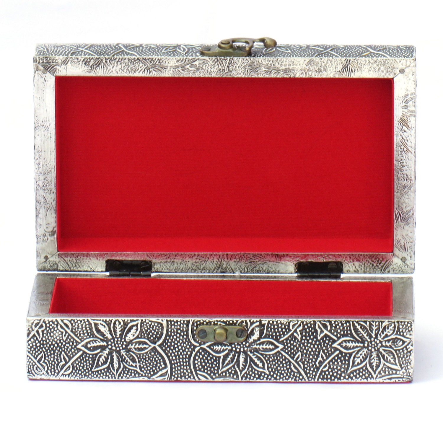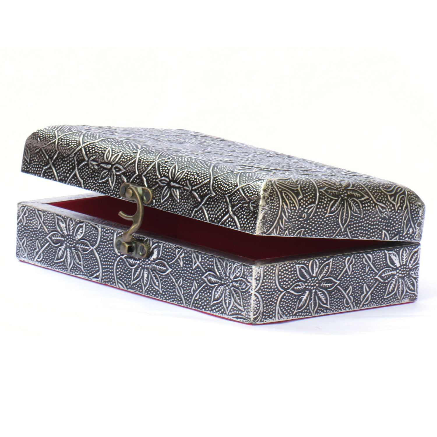 This Woodino Silver Covered MDF Jewellery Box (8×5 inches) is a stunning blend of tradition and utility. Handcrafted with oxidised silver metal patra work, it features a durable MDF base with a stylish antique look.