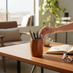Woodino Wooden Barrel Shape Stationery & Pen Holder – Multipurpose Cutlery Organizer for Kitchen, Dining & Office Table