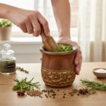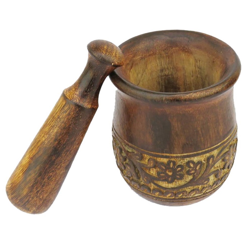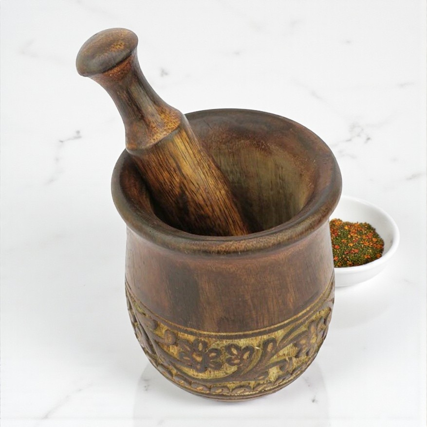 Woodino Wooden Spice Mortar & Pestle In Natural Size Mortar. This Traditional wooden spice mortar is perfect for preparing the paste of garlic, ginger, and other spices. This Mortar and Pestle is beautifully designed with a flawless finish, which is an attractive addition to your kitchen collection. The shining finish of the outer and inner areas gives an elegant appeal. The smooth and shining texture ensures comfortable usage, hence it is Eco-friendly and easy to clean and maintain.
