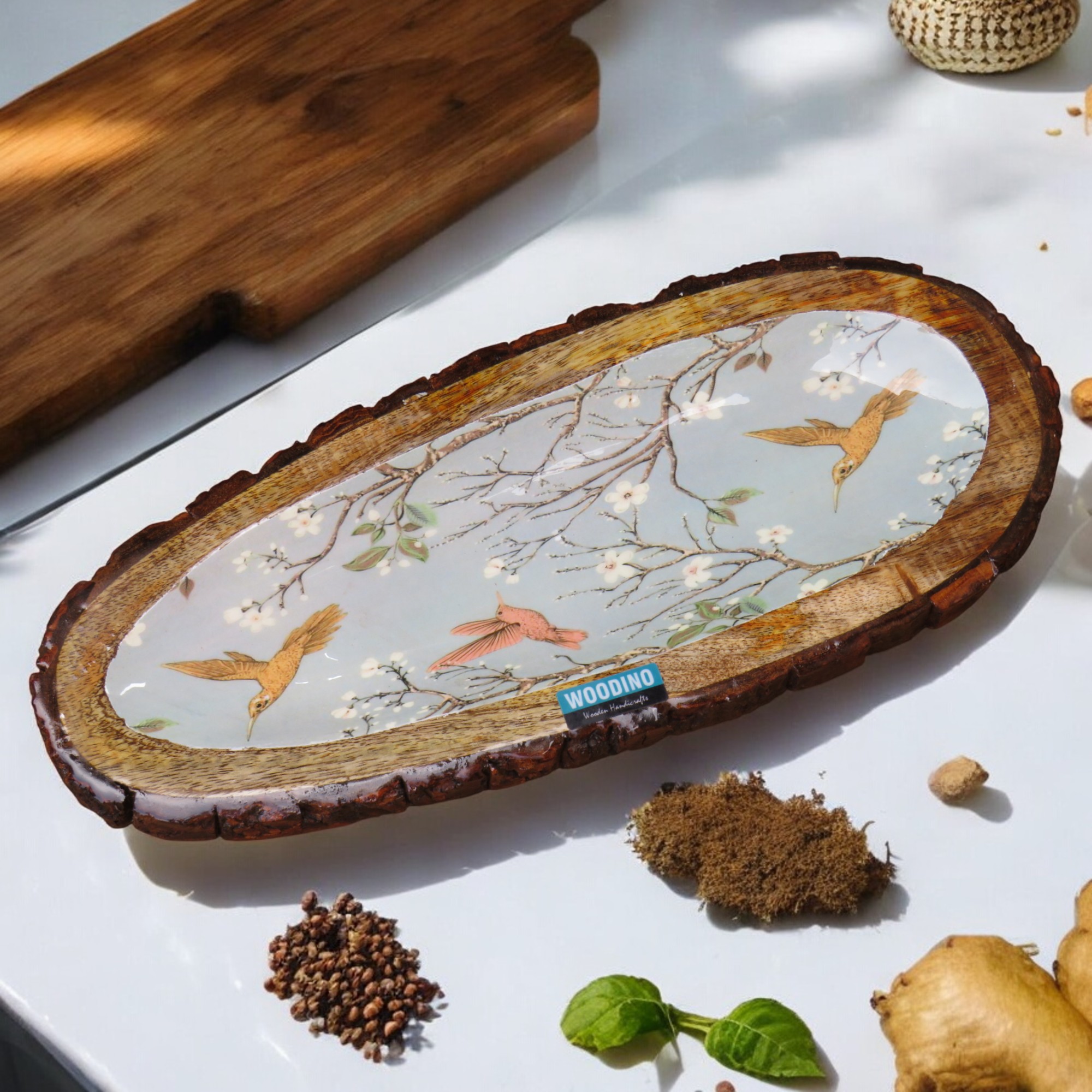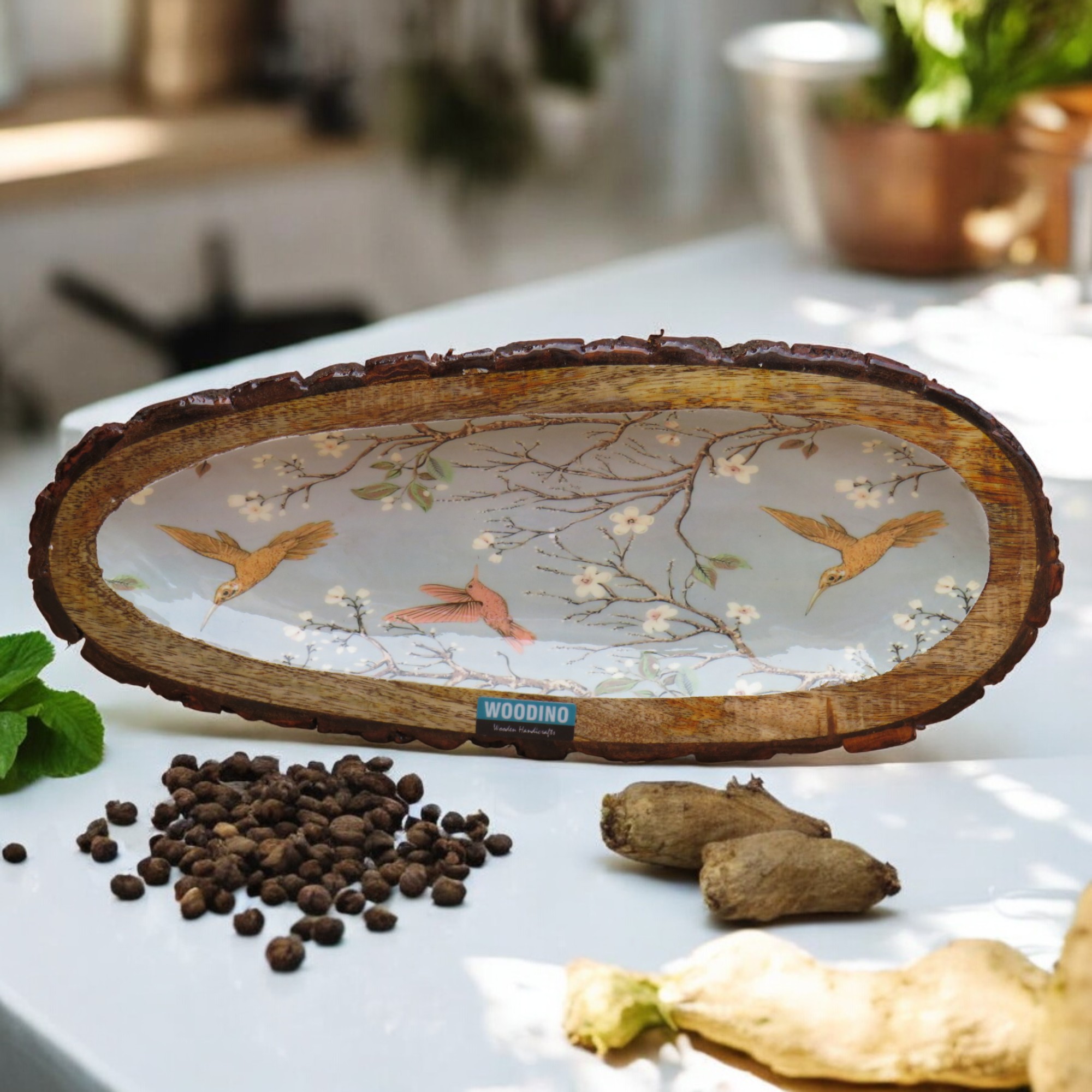 Whether used as a serving tray, decorative platter, or display piece, this eco-friendly wooden tray adds a warm, natural charm to any table setting. A perfect blend of art and utility for your kitchen or dining table.
