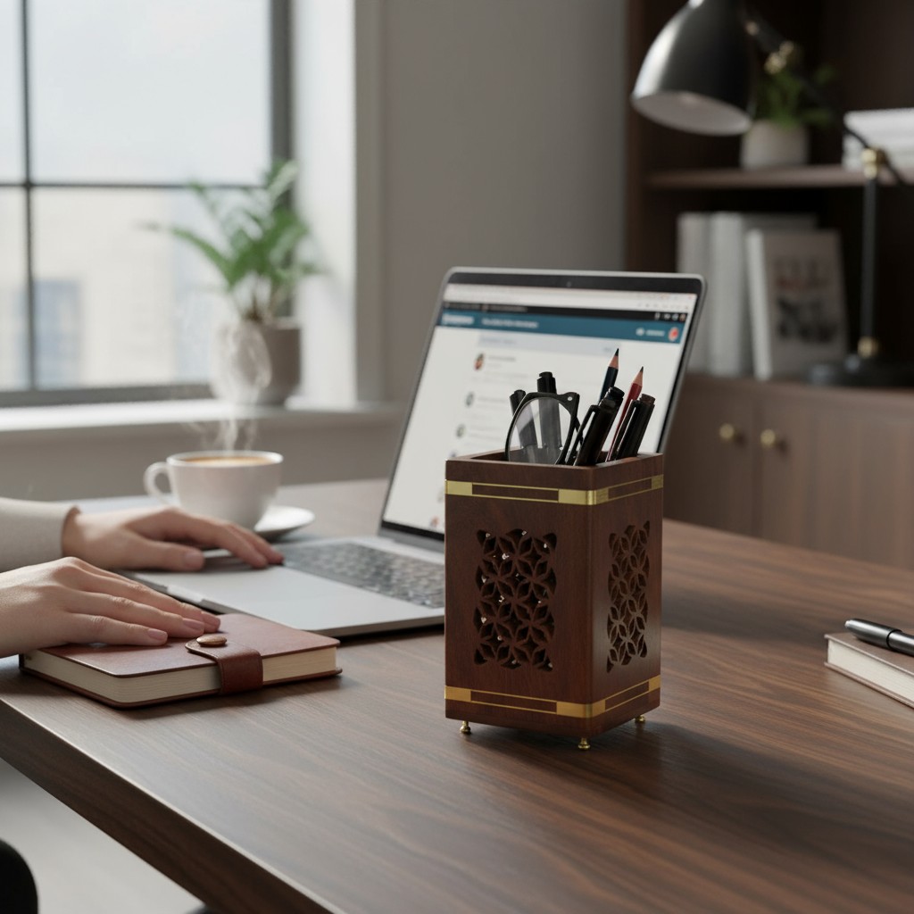 Keep your space organized with this Wooden Stationery & Pen Holder. Crafted from premium quality wood, this multipurpose holder is perfect for pens, pencils, stationery, cutlery, or kitchen utensils, combining functionality with rustic charm.